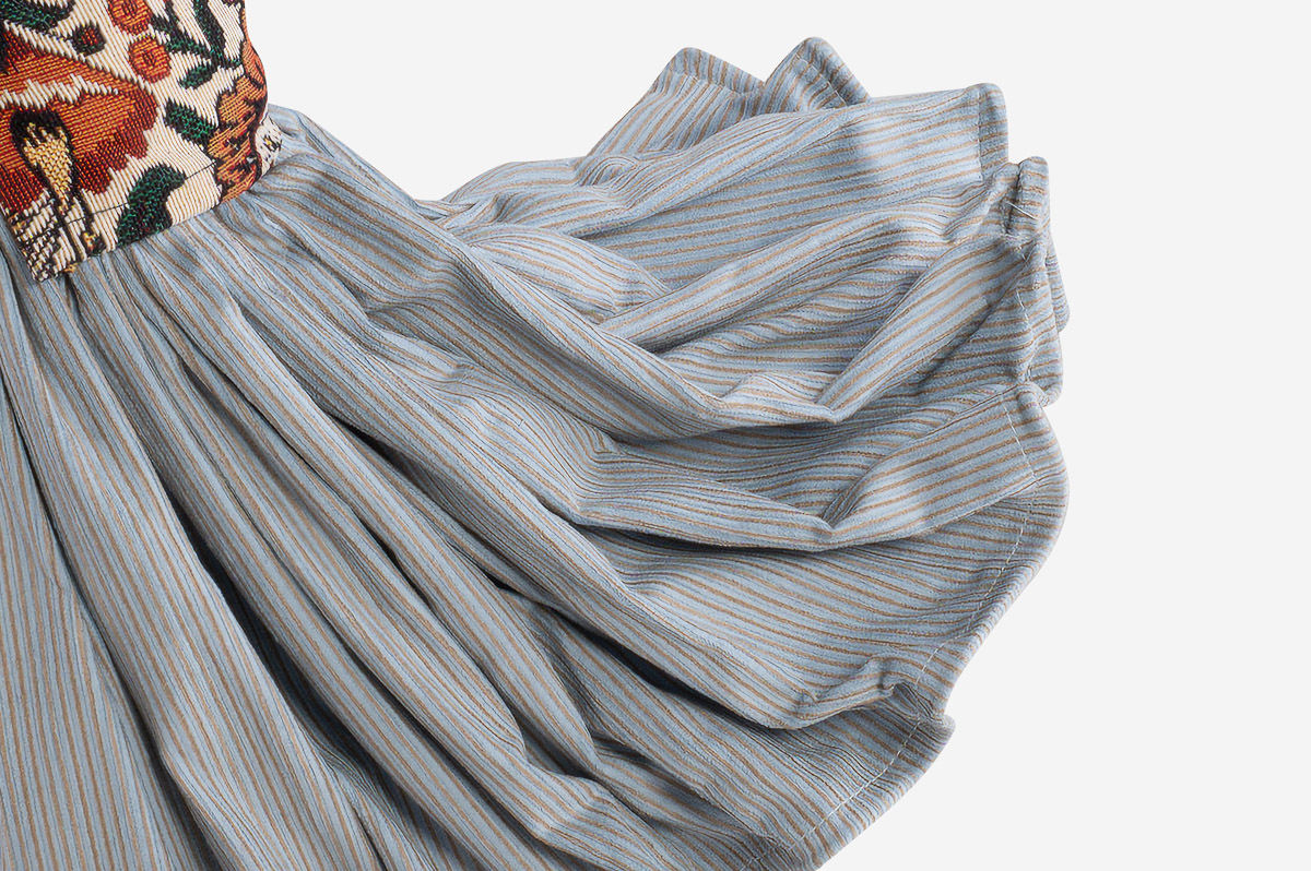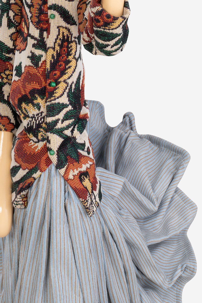 Girl Lamp Galini von Skitso ist eine kunstvolle Tischlampe. Galini trägt einen ganz fein gestreiften Rock und ein florales Oberteil mit kleinen grünen Knöpfen. Der Lampenschirm ist hellblau - das findet sich in der Strumpfhose wieder.