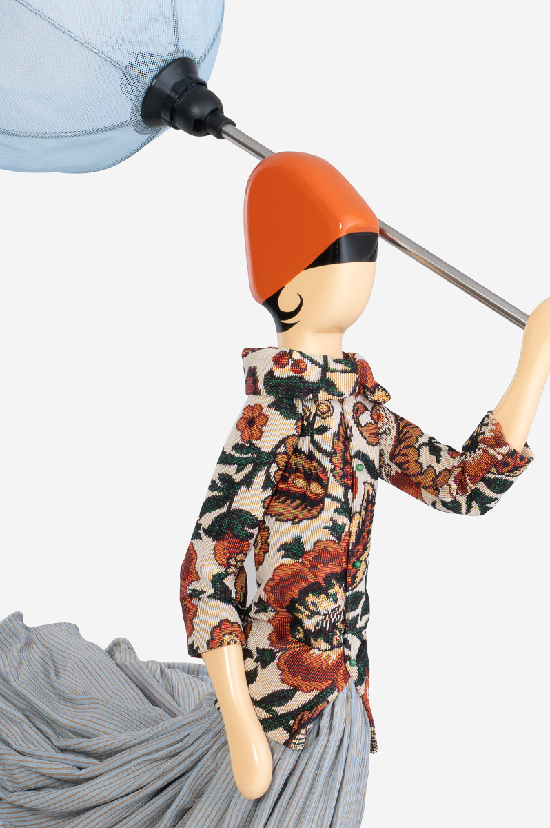 Diese Lampe von Skitso zeichnet sich durch das ungewöhnliche Design aus. Eine Frau mit Schirm und Rock wird vom Winde verweht.