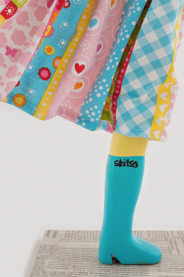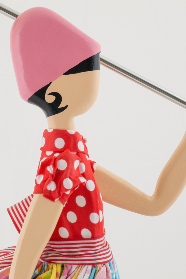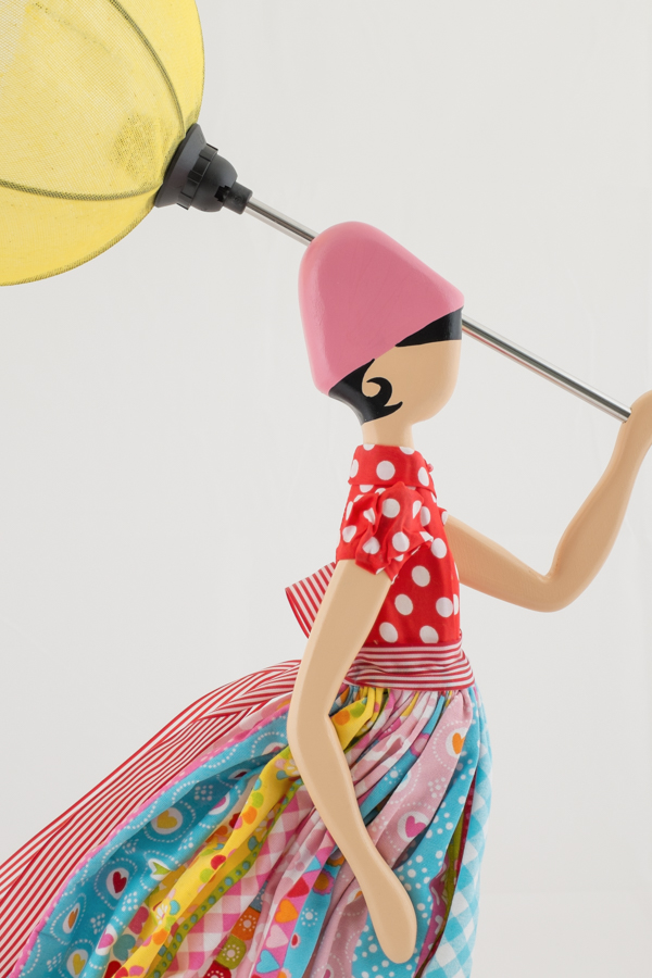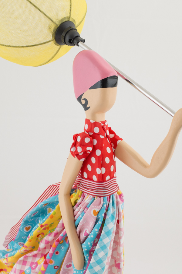 Girl Lamp Iris von Skitso ist bunt und fröhlich - ein echter Farbtupfer. Sie trägt eine rot-weiß getupfte Bluse und einen farbenfrohen Rock im Mustermix. Der Lampenschirm erweckt die Illusion eines im Wind umgeklappten Regenschirms, der Rock der Frauenfigur weht in die gleiche Richtung. Die Figur und der Sockel sind aus Holz, die Bekleidung ist aus versteiftem Stoff. Die Lampe ist ca. 85 cm hoch.