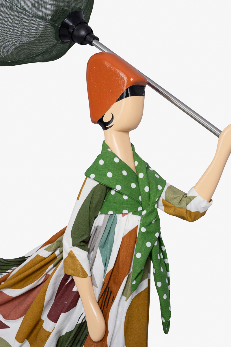 Wie typisch für die Skitso Girl Lamps gibt es auch hier den verwehten Rock und den Regenschirm als Lampenschirm.
