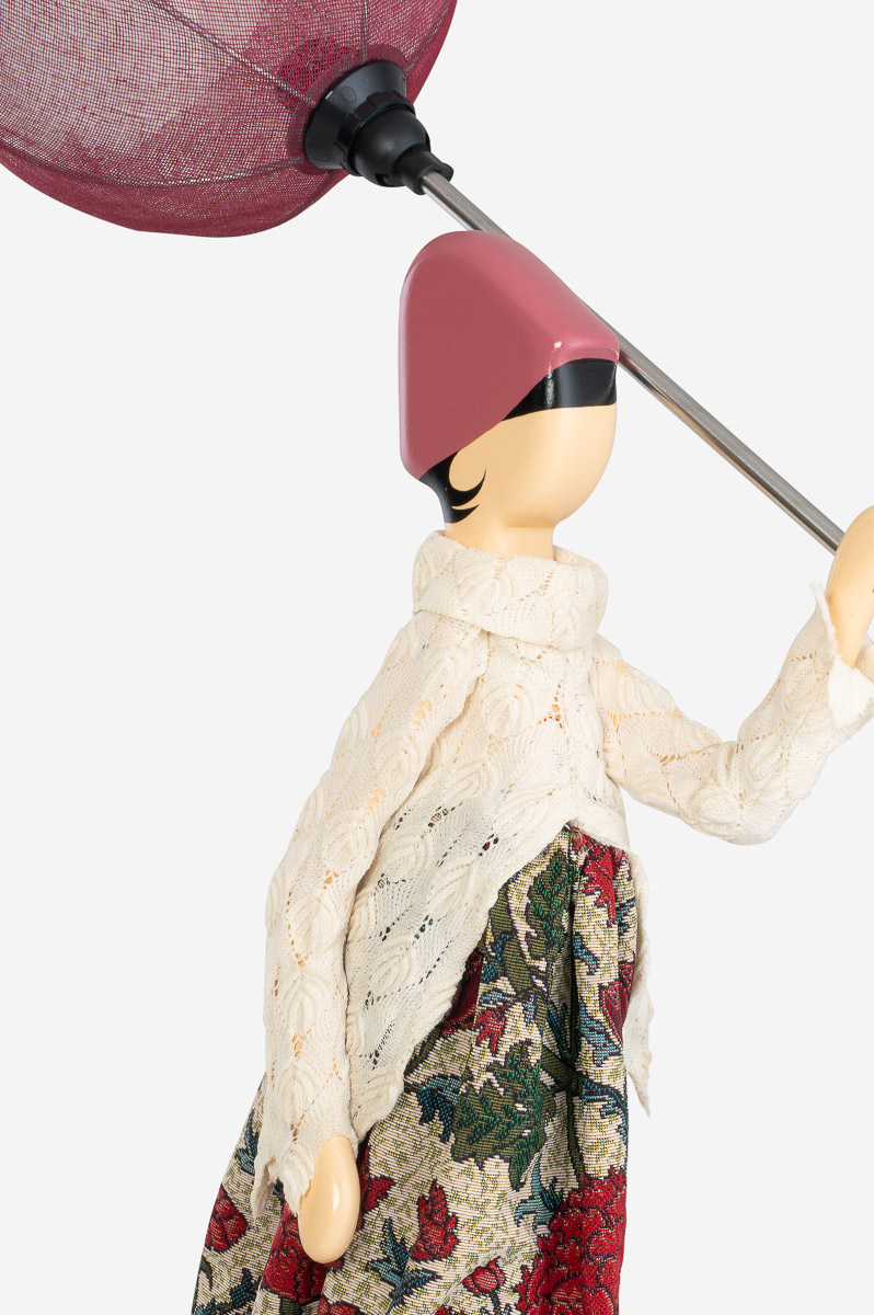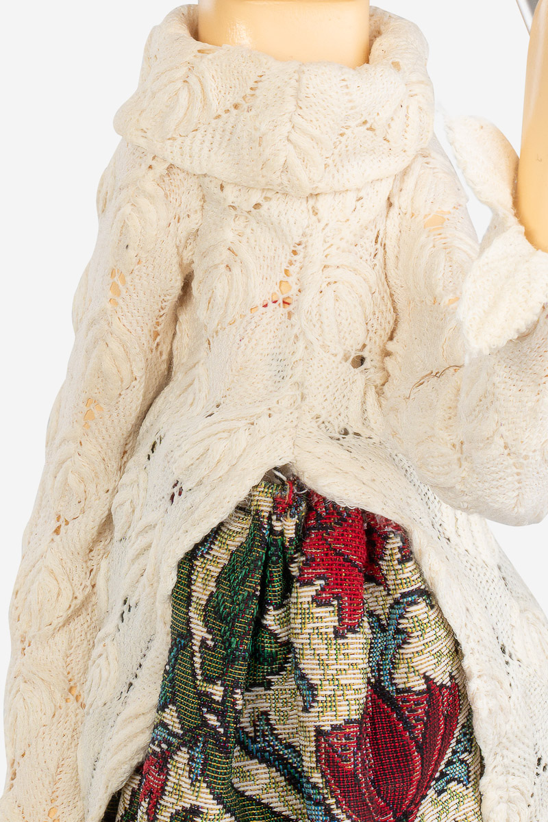 Girl Lamp Karni von Skitso ist eine Tischlampe, die Gemütlichkeit ausstrahlt. Karni trägt über dem blumigen Rock eine kuschelige Strickjacke in Wollweiß.