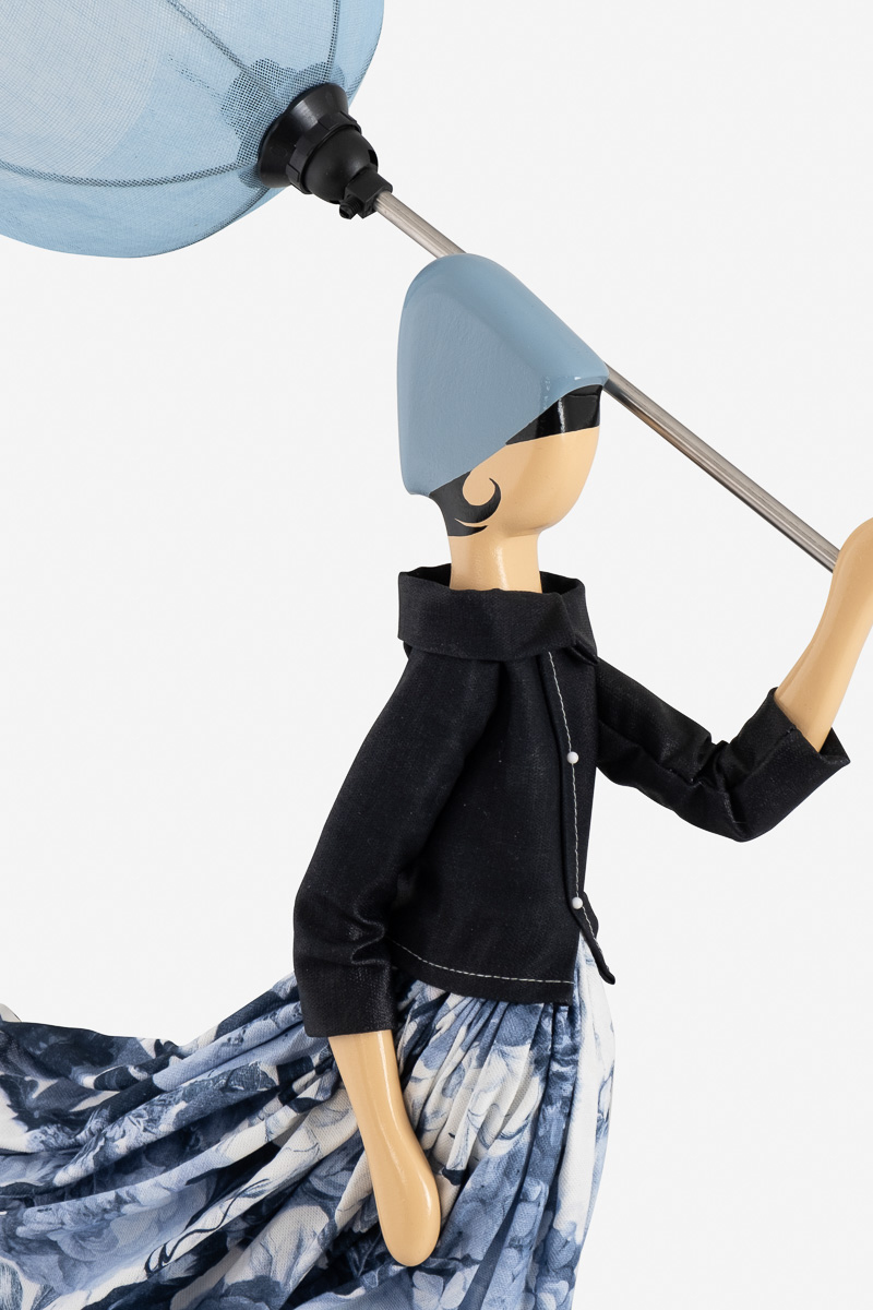 Diese Lampe von Skitso zeichnet sich durch das ungewöhnliche Design aus. Eine Frau mit Schirm und Rock wird vom Winde verweht.