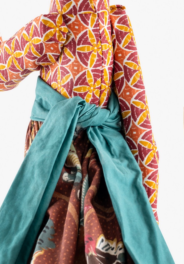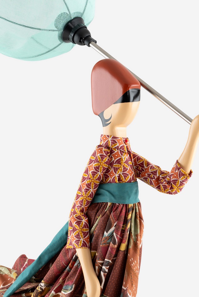 Skitso Girl Lamp Kavita trägt einen tollen Mustermix im Outfit und einen helltürkisen Regenschirm. Ein besonderer Akzent ist die petrolfabene Schärpe.