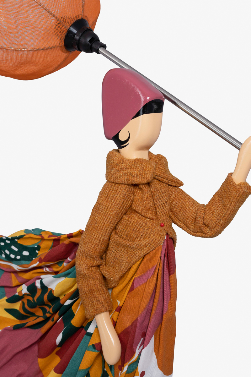 Diese Lampe von Skitso zeichnet sich durch das ungewöhnliche Design aus. Eine Frau mit Schirm und Rock wird vom Winde verweht.