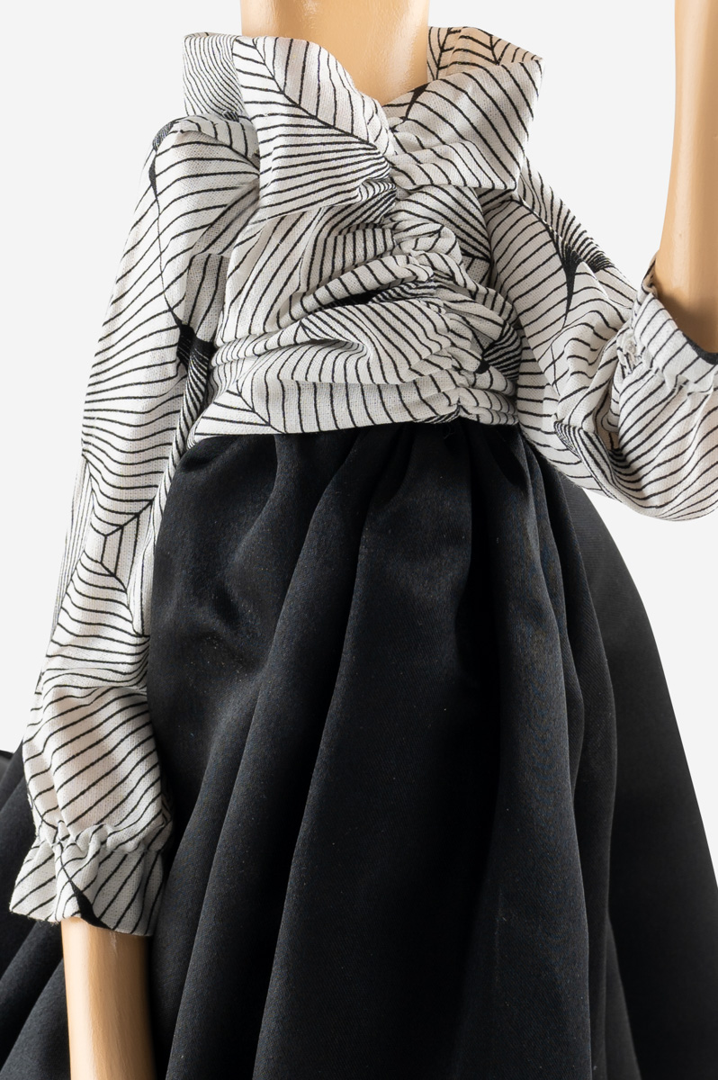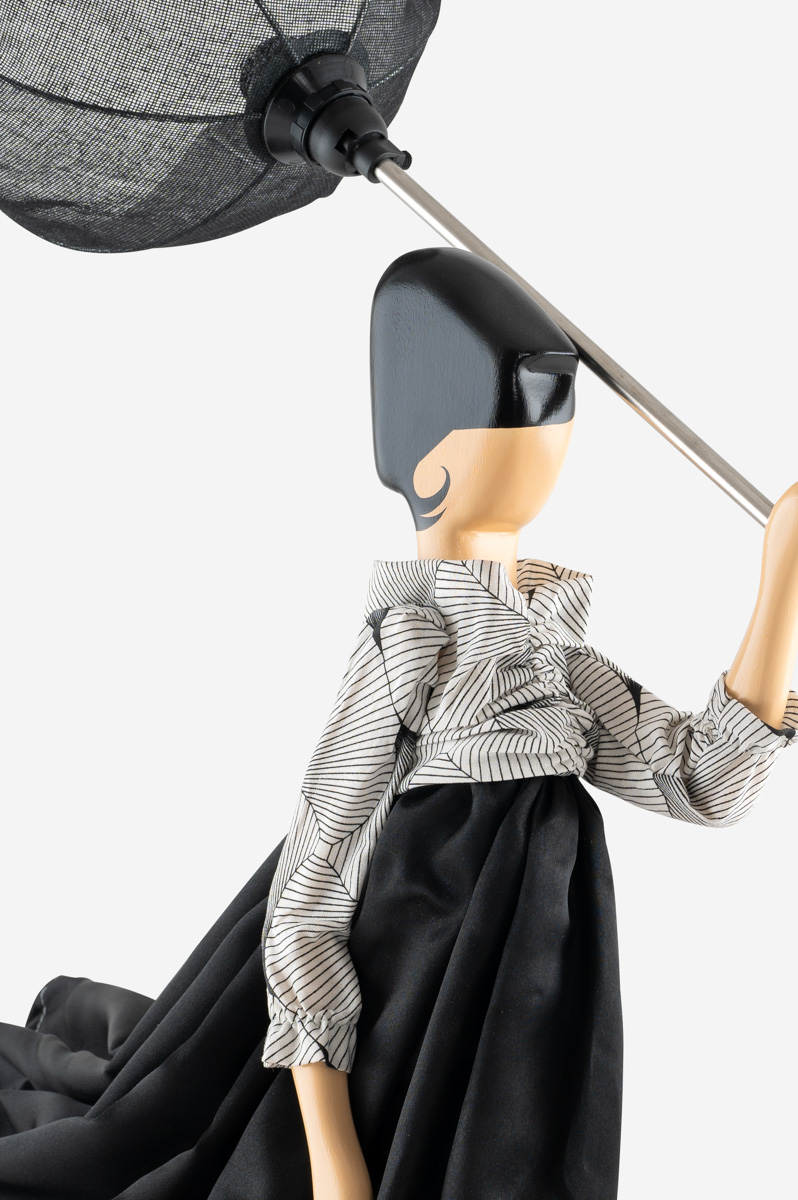 Die elegante Skitso Girl Lamp Lyckia trägt eine Garderobe in Schwarz und Weiß. Ob sie gerad auf dem Weg ins Theater ist? Der edle Samtrock und die gerüschte Bluse würden dazu passen. Der Regenschirm ist schwarz und dient gleichzeitig als Lampenschirm. Ein besonderer Akzent ist die rote Strumpfhose.