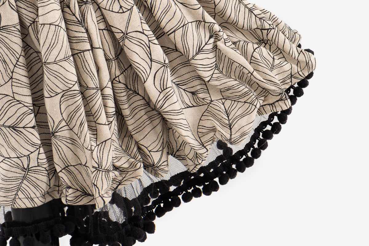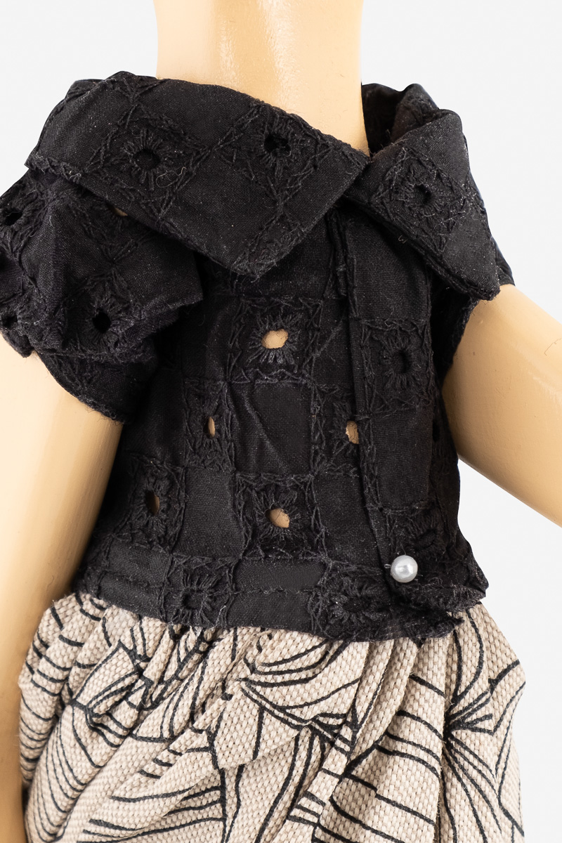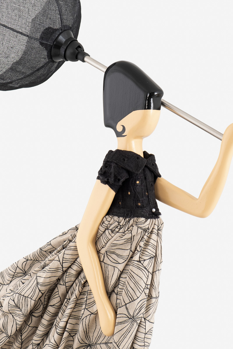 Eine ganz besondere Lampe: Skitso Little Girl Lamp Lyra trägt einen tollen Materialmix in ihrem Outfit in Schwarz und beige. Die Bluse hat eine Lochstickerei, der Rock einen Blätterprint, der Unterrock eine spezielle Borte. Wie typisch für die Skitso Girl Lamps gibt es auch hier den verwehten Rock und den Regenschirm als Lampenschirm. Gefällt sie euch?