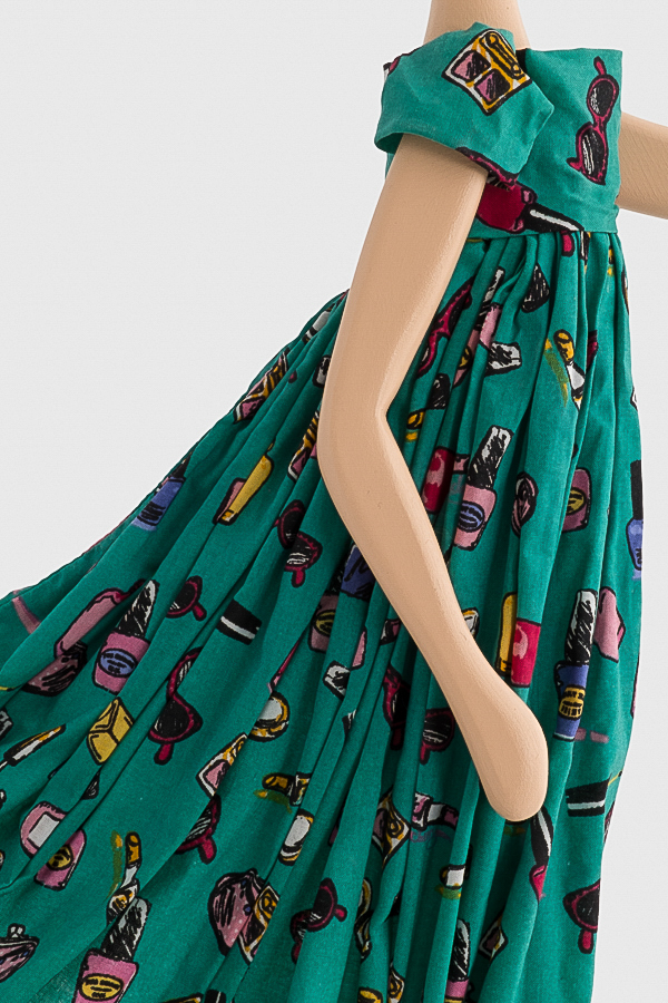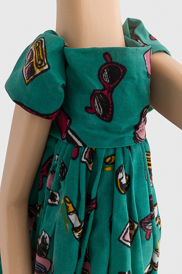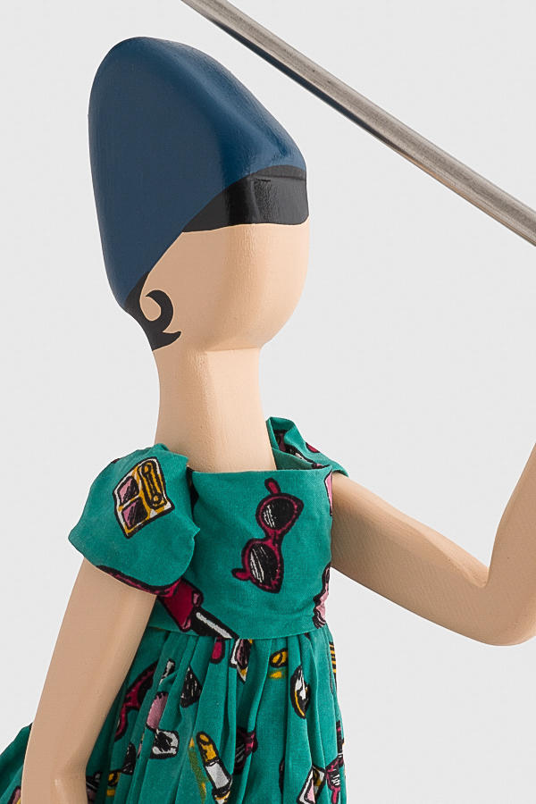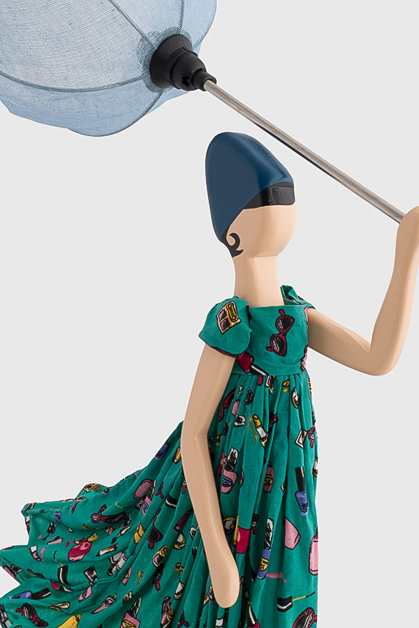 Girl Lamp Makenzie trägt einen hellblauen Schirm. Mütze und Stiefel sind in einem Petrolblau aufeinander abgestimmt. Auf dem dunkeltürkisenen Kleid befinden sich Prints von allerlei Damen-Utensilien.
