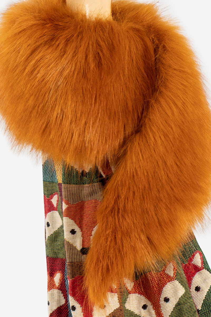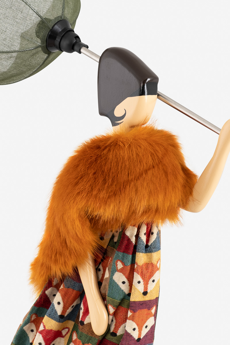 Eine ganz besondere Lampe: Skitso Little Girl Lamp Mariyio ist im Design ganz auf das Thema Fuchs gestylt. Das Kleid hat einen schicken Print mit Füchsen, der mondäne Pelz ist natürlich Webpelz. Wie typisch für die Skitso Girl Lamps gibt es auch hier den verwehten Rock und den Regenschirm als Lampenschirm.