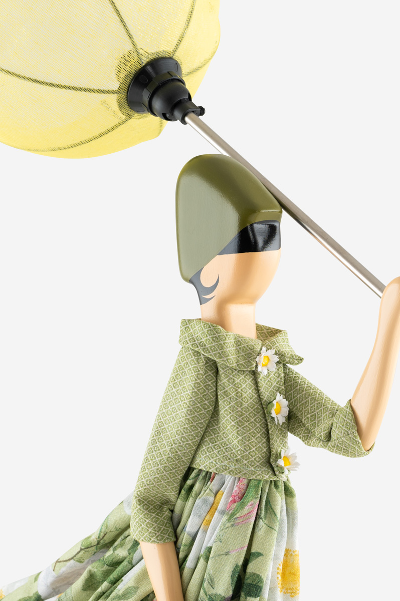 Mit Skitso Girl Lamp Millimou zieht eine Blumenwiese in deine Wohnung ein. Die Kleidung der Lampendame ist in harmonischen Grüntönen gehalten und ist ein Highlight in der Einrichtung. Der Regenschirm ist gelb und dient gleichzeitig als Lampenschirm. Ein besonderes Detailsind die 3D Blüten am Oberteil.