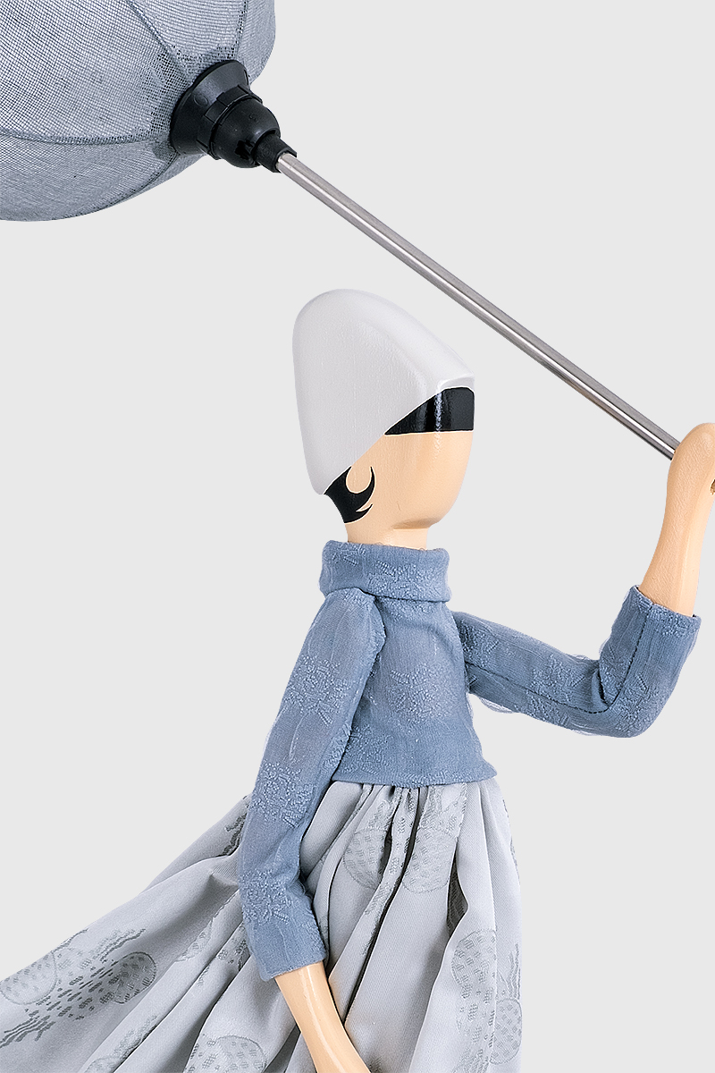 Der hochwertige Lampenkörper wird in Handarbeit hergestellt. Auch die Farben sind handbemalt. Die Figur besteht aus Massivholz und steht auf einer Holzplatte, die mit Papier beklebt ist. Die Kleidung besteht aus versteiften Textilien. Das Leuchtmittel wird im Schirm eingesetzt, der mit einer Metallstange mit der Figur verbunden ist.