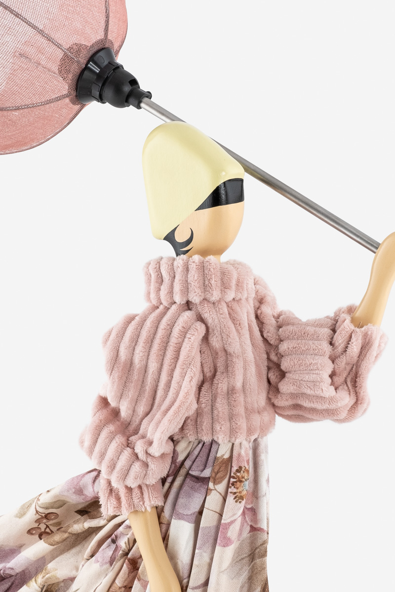 Girl Lamp Ririka von Skitso ist eine kunstvolle Stehlampe mit einem besonderen Look. Bei einem Spaziergang im Regen, wird die Frau von einem Wind erfasst, der Rock und Kleid verweht und den Schirm umklappt. Girl Lamp Ririka trägt einen altrosa Regenschirm. Die Bekleidung ist in angenehmen natürlich wirkenden Rosé-Farbtönen gehalten. Der samtige Breitcordpulli und das Pflanzenmuster im Rock unterstützen den kuscheligen Landhaus-Look.