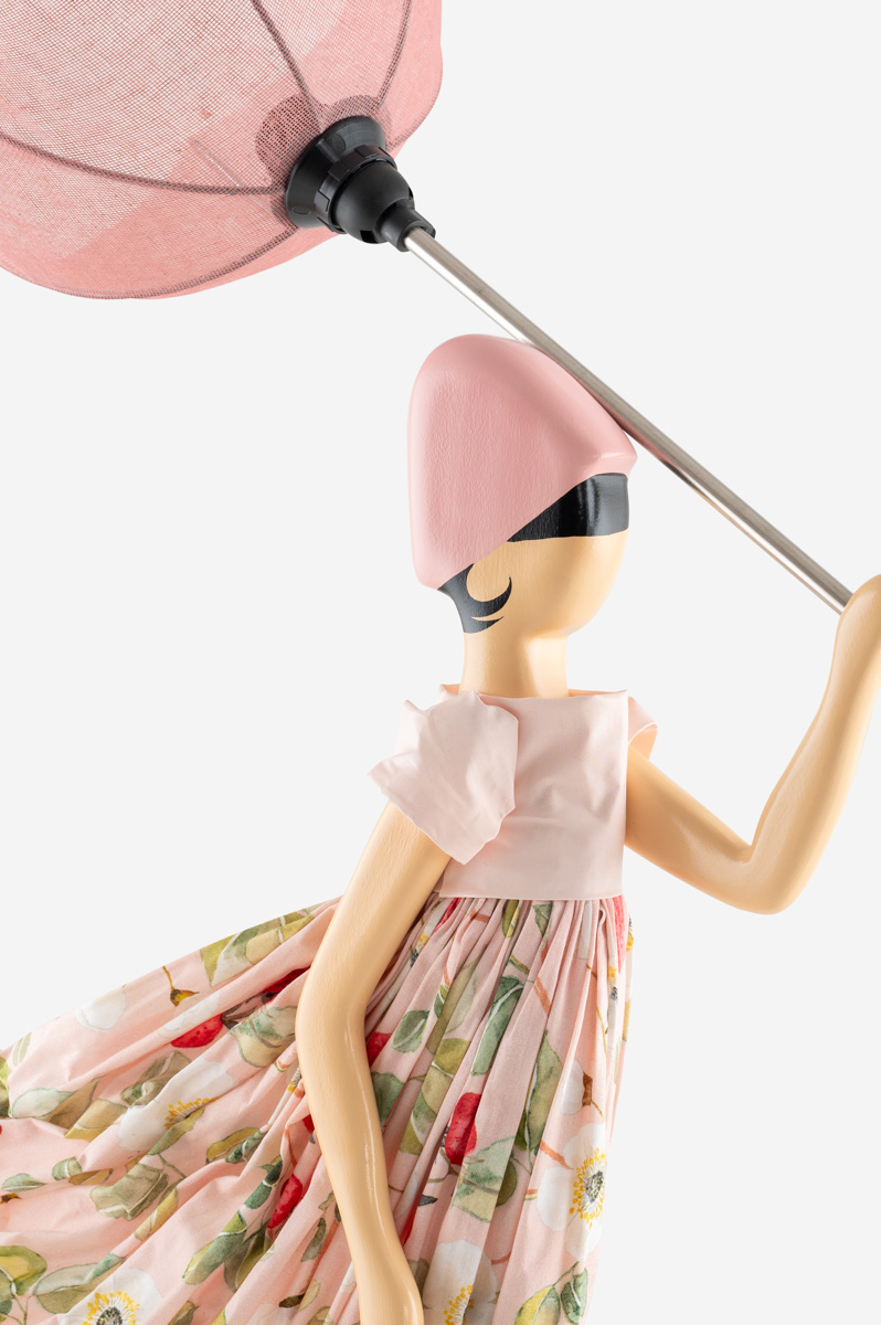 Ein Traum in Rosé und Erdbeerrot: Das ist Skitso Girl Lamp Roula. Roula trägt zartesommerliche Kleidung mit Erdbeerpflanzenprint in Weiß und Rosa und einen hellrosa Regenschirm. Ein besonderer Akzent sind die rosaroten Stiefel. Diese schöne Lampe verbreitet sommerlich-romantisches Flair.