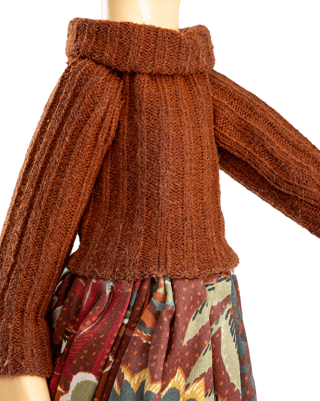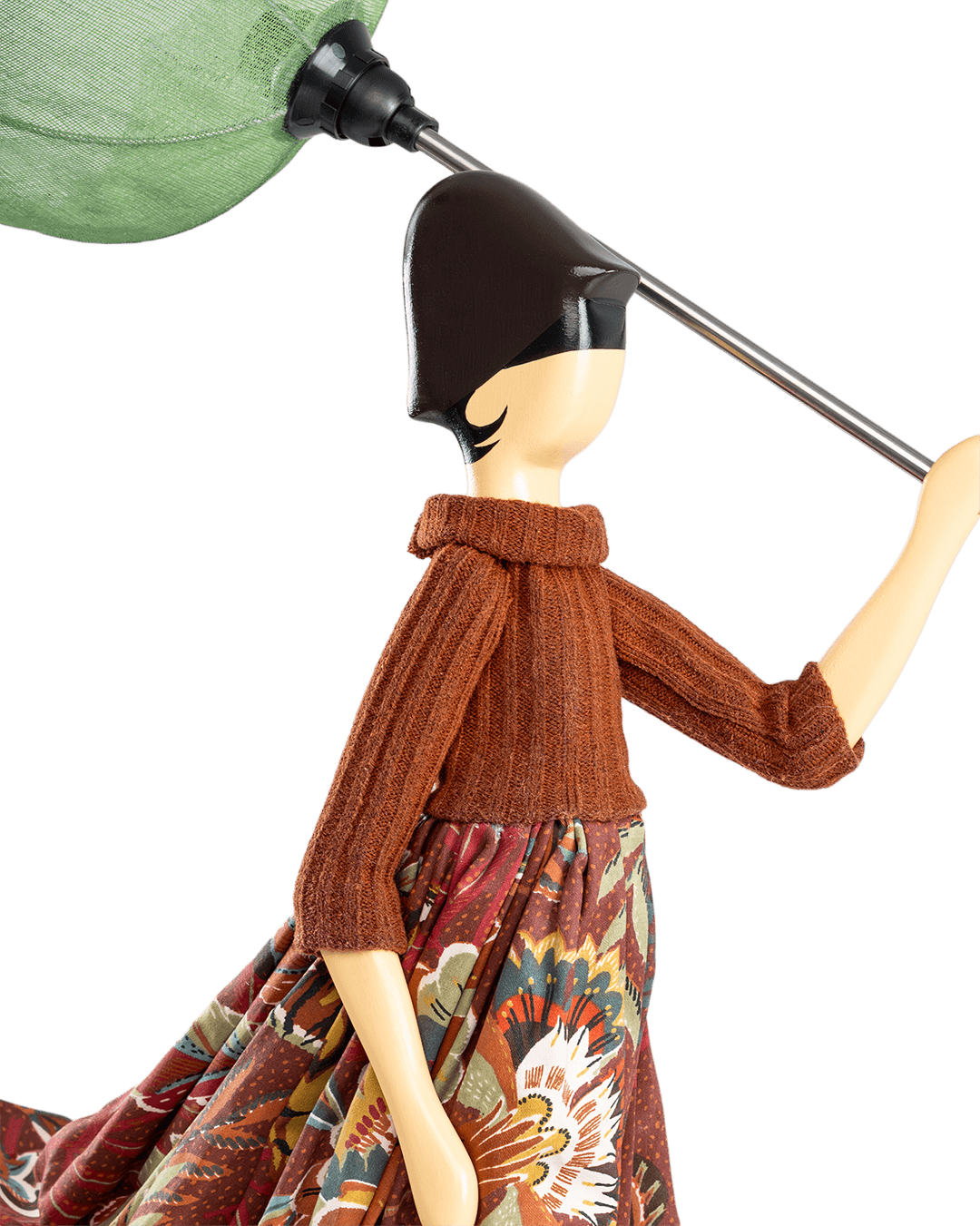 Eine der geliebten Lampen 'mit der Frau mit umgeklapptem Schirm': Skitso Little Girl Sarabo ist eine wunderhübsche Tischlampe in warmen Farbtönen mit Rollkragenpulli.