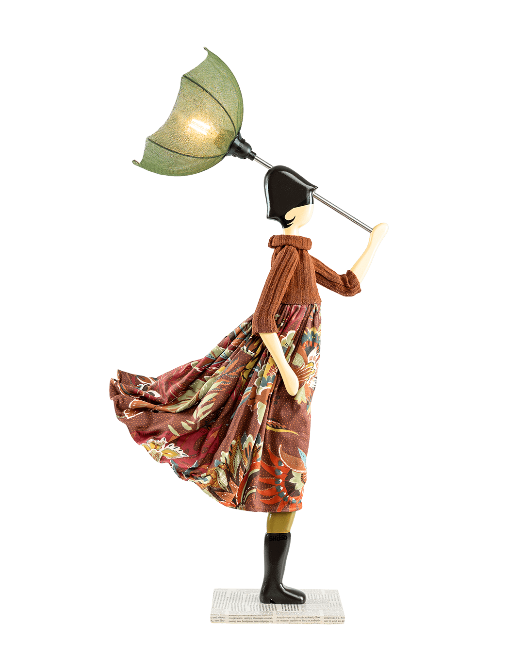 Diese Lampe von Skitso zeichnet sich durch das ungewöhnliche Design aus. Eine Frau mit Schirm und Rock wird vom Winde verweht.