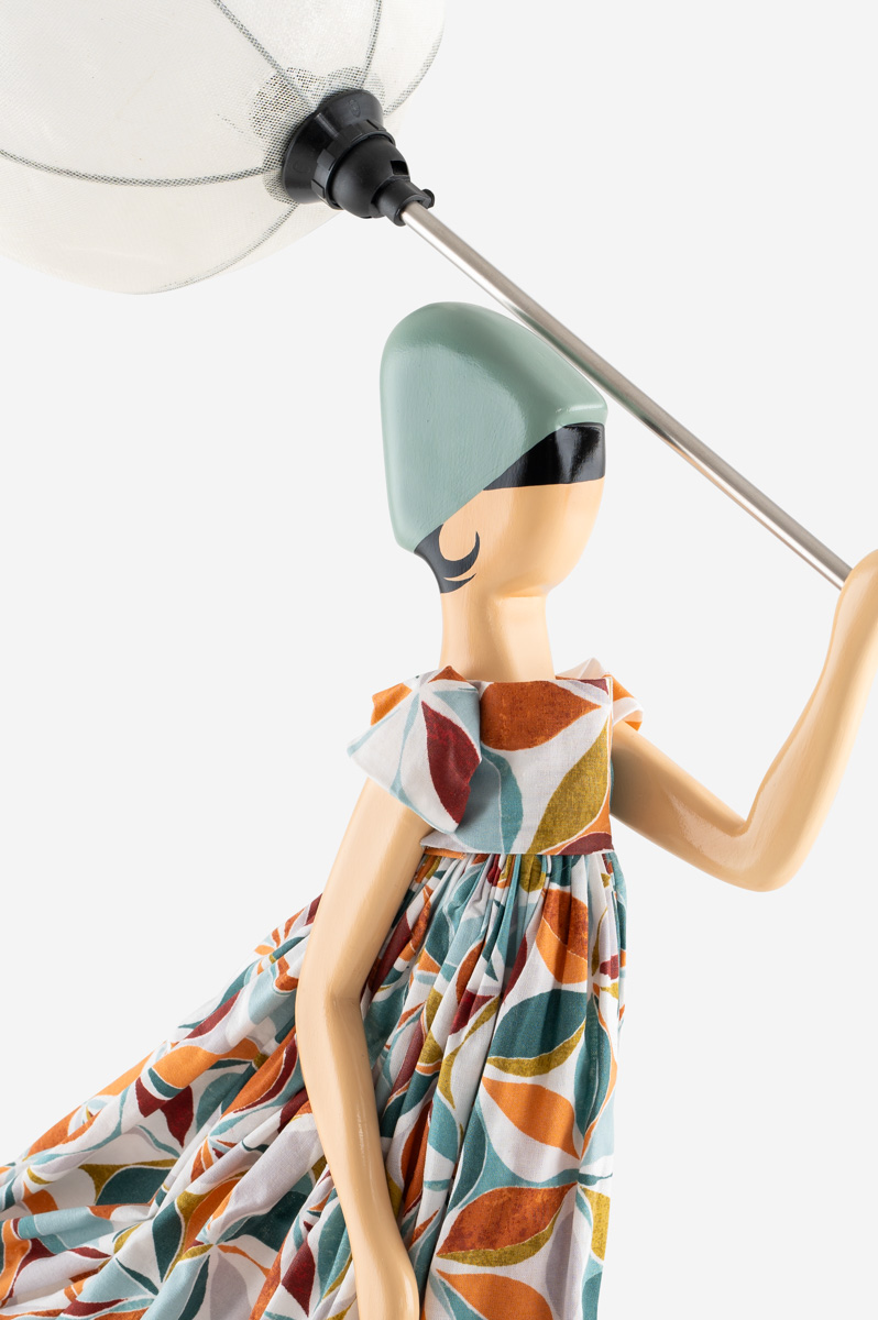 Diese Lampe von Skitso zeichnet sich durch das ungewöhnliche Design aus. Eine Frau mit Schirm und Rock wird vom Winde verweht.