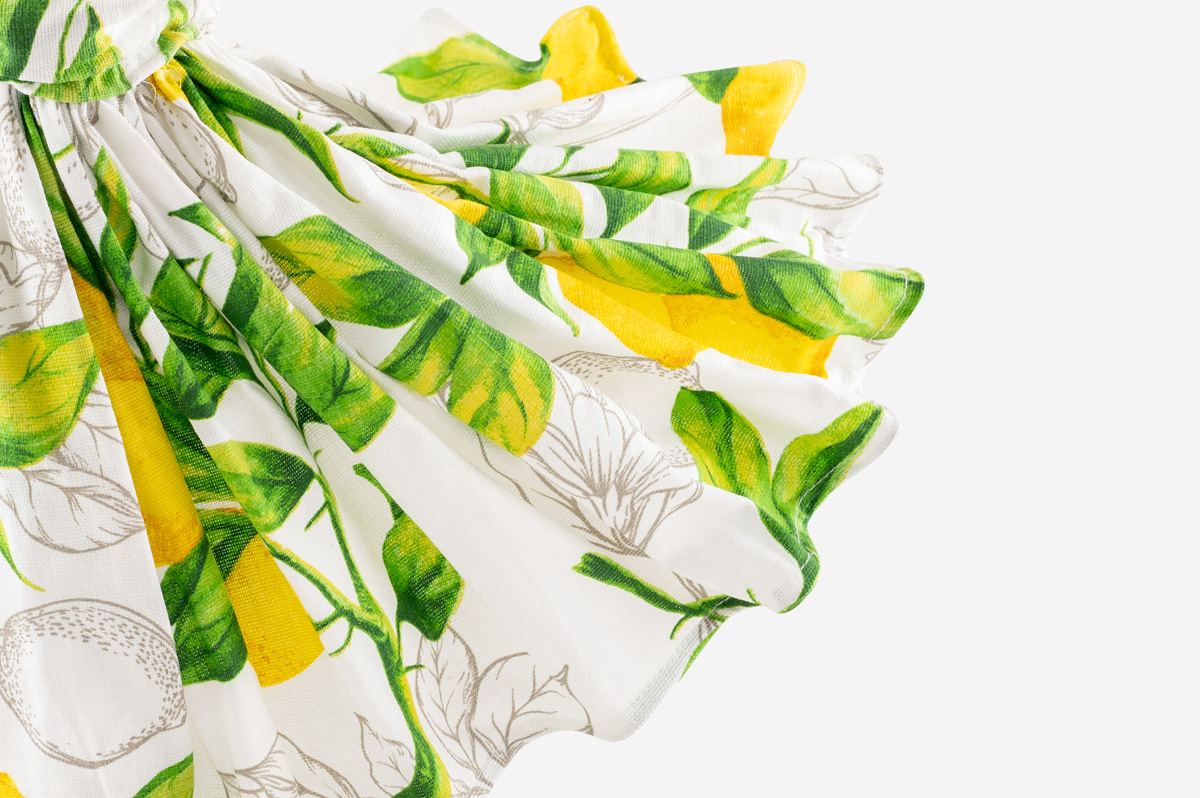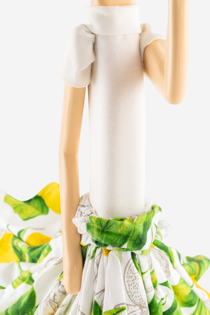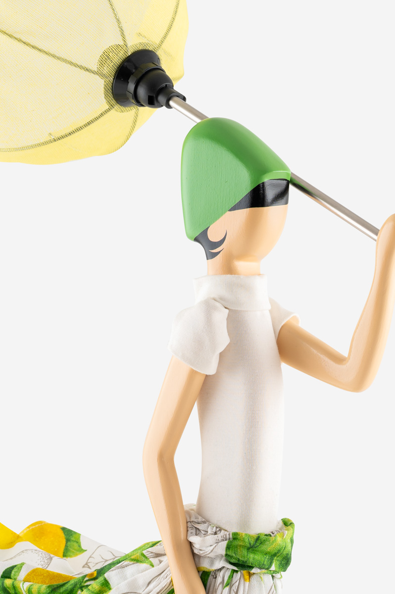 Skitso Girl Lamp Tonika entführt dich in einen mediterranen Zitronenhain! Tonika trägt einen fröhlichen Rock mit Zitronen und Blättern. Der Regenschirm ist gelb verbreitet sonnige Lichtstimmung. Ein besonderer Akzent sind die grüne Mütze und die grünen Stiefel.