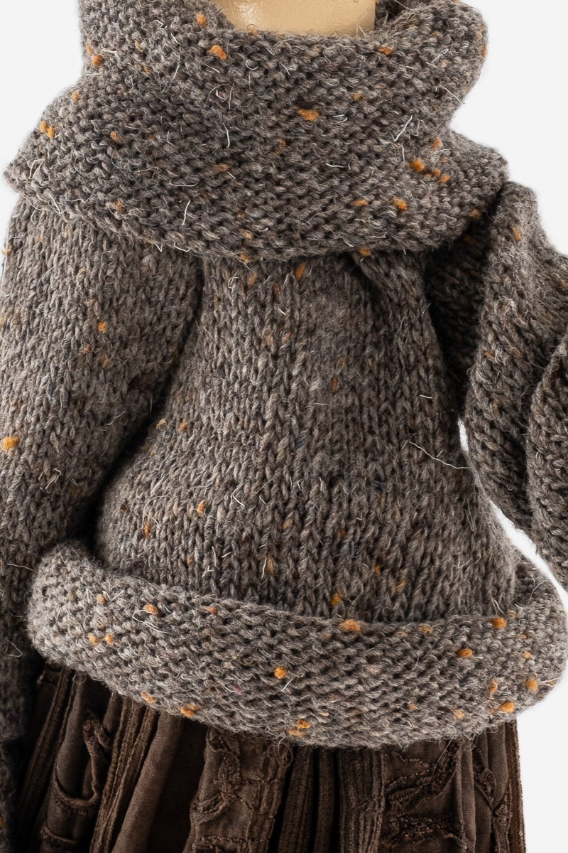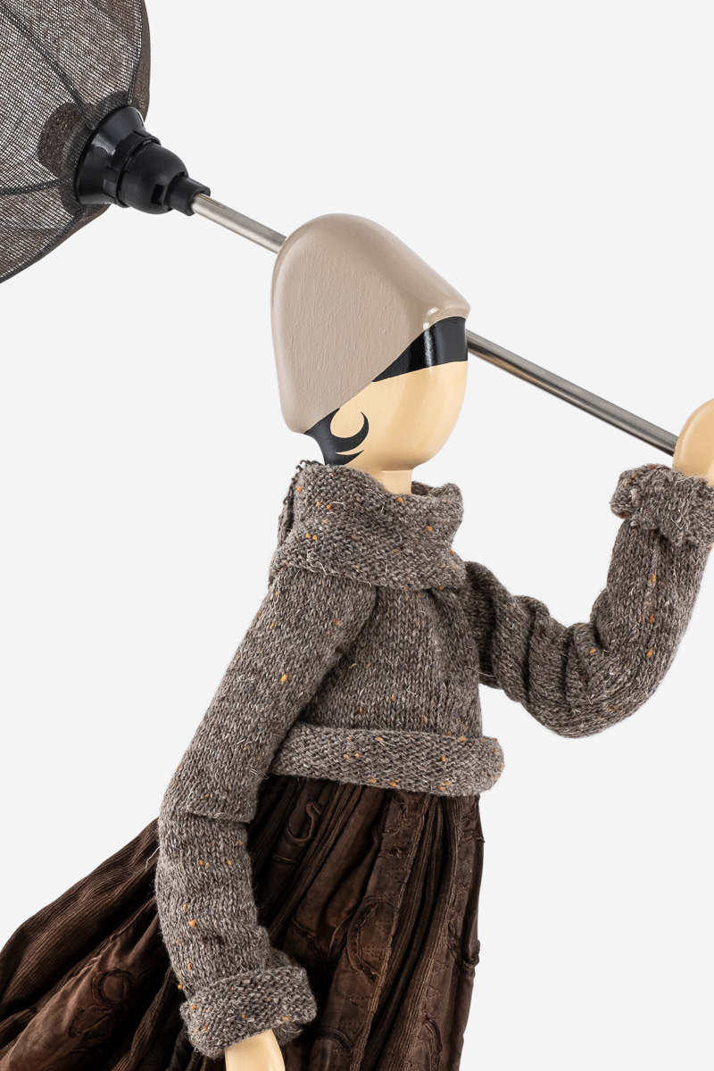 Girl Lamp Touiyara von Skitso ist mit ihrer warmen Winterkleidung eine kunstvolle Stehlampe mit einem besonderen Look. Bei einem Spaziergang im Regen, wird die Frau von einem Wind erfasst, der Rock und Kleid verweht und den Schirm umklappt. Girl Lamp Touiyara trägt einen schwarzen Regenschirm.