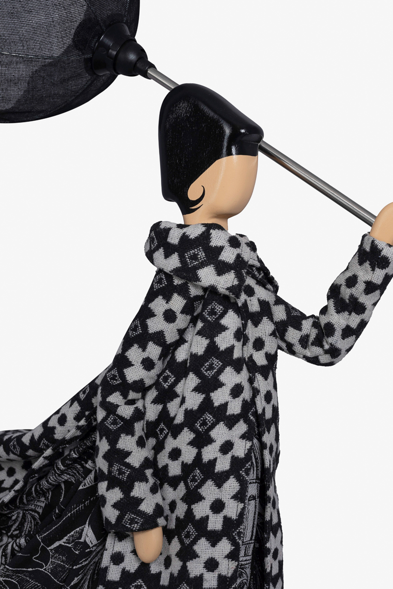 Diese Lampe von Skitso zeichnet sich durch das ungewöhnliche Design aus. Eine Frau mit Schirm und Rock wird vom Winde verweht.