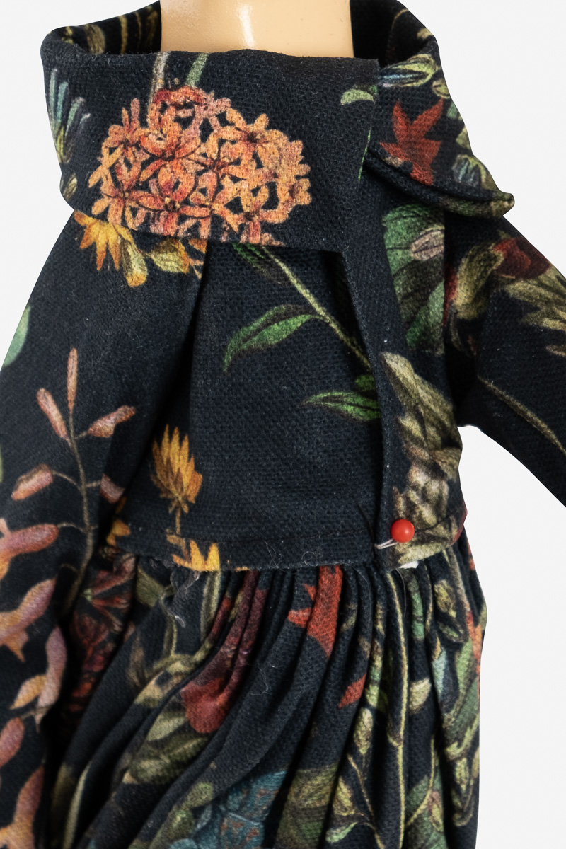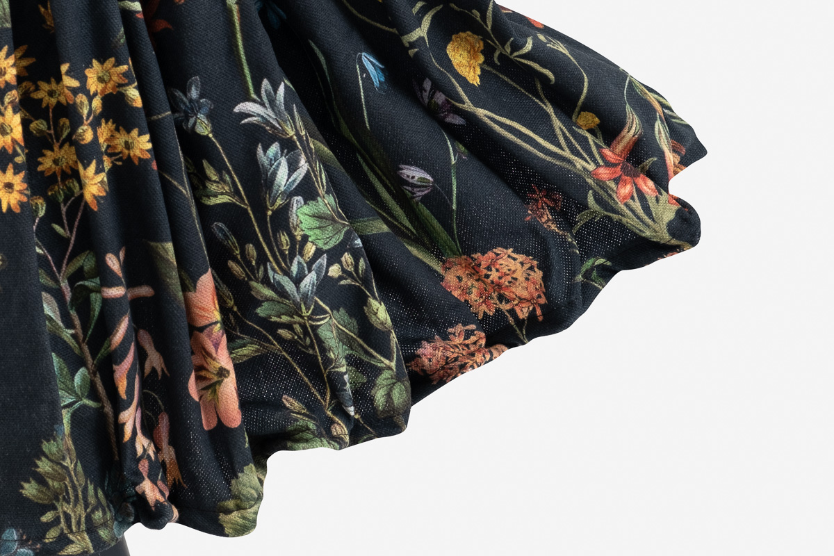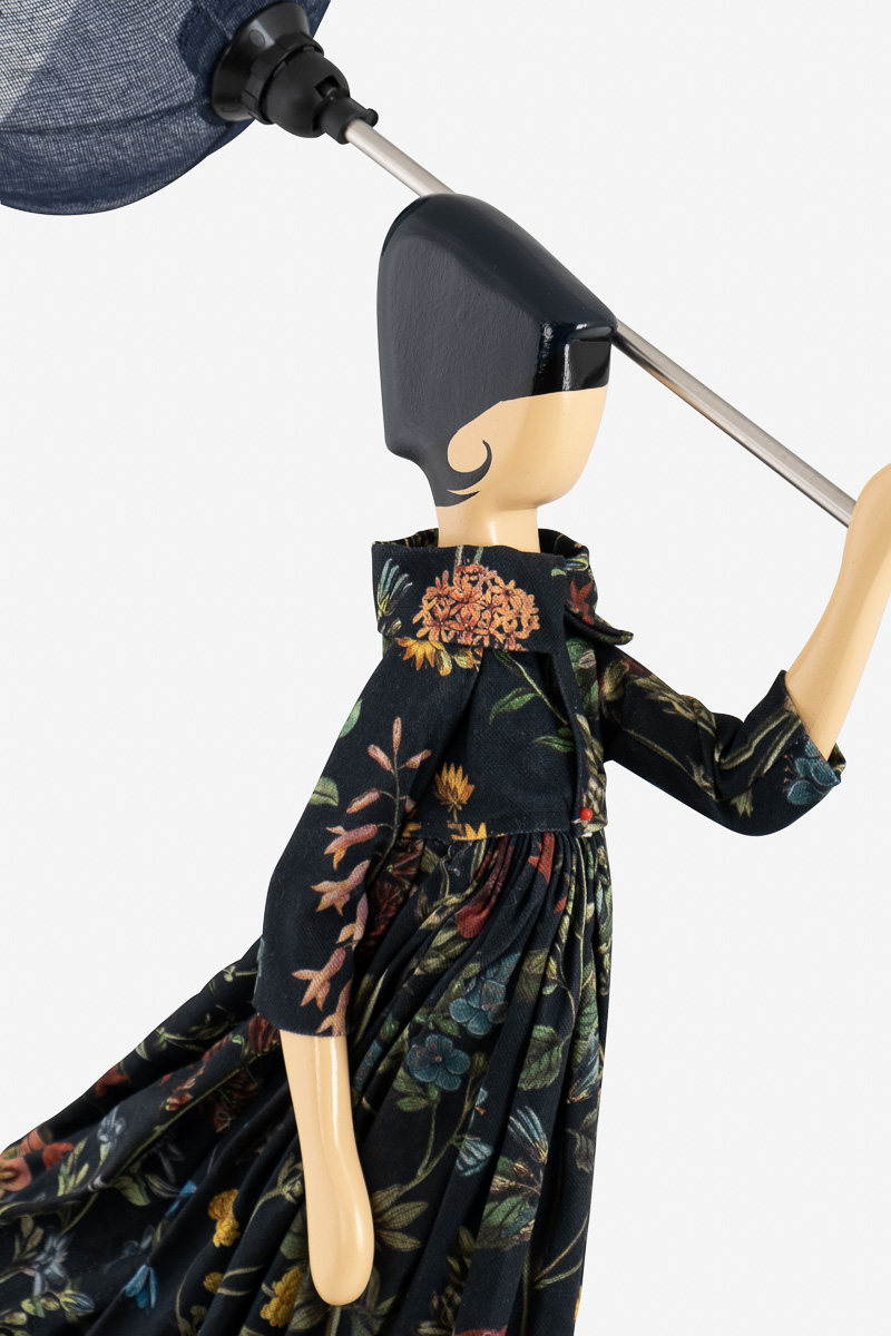 Eine ganz Blumenwiese findet sich auf dem schönen dunklen Kleid von Skitso Little Girl Lamp Zakinda - ein ganz besondere Lampe. Wie typisch für die Skitso Girl Lamps gibt es auch hier den verwehten Rock und den Regenschirm als Lampenschirm.