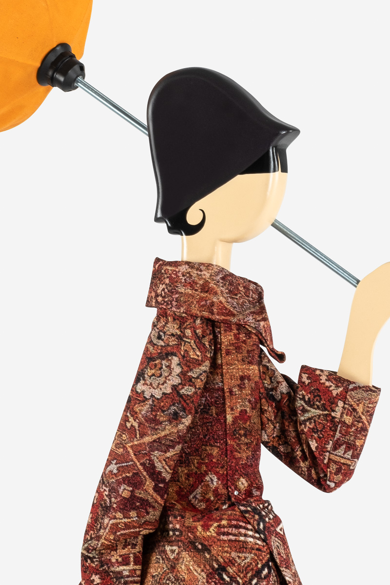 Diese Lampe von Skitso zeichnet sich durch das ungewöhnliche Design aus. Eine Frau mit Schirm und Rock wird vom Winde verweht.