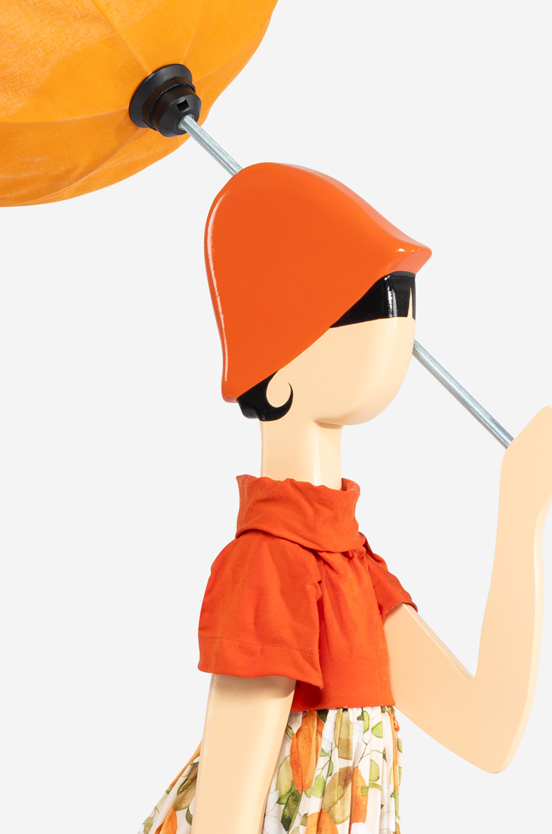 Diese Lampe von Skitso zeichnet sich durch das ungewöhnliche Design aus. Eine Frau mit Schirm und Rock wird vom Winde verweht.