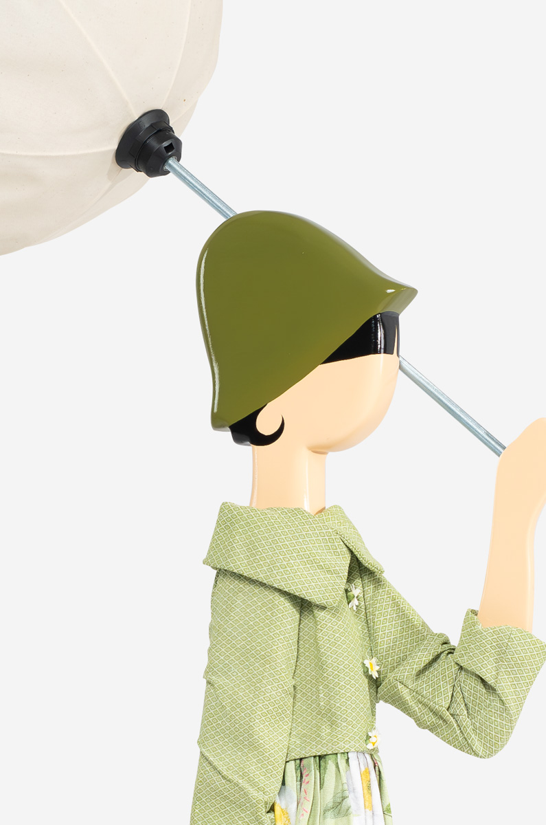 Diese Lampe von Skitso zeichnet sich durch das ungewöhnliche Design aus. Eine Frau mit Schirm und Rock wird vom Winde verweht.
