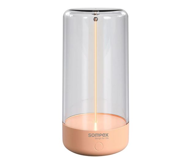 Hier in Apricotfarben oder auch Peach: die witzige aufladbare Tischleuchte für Drinnen und Draußen heißt PULSE von Sompex.