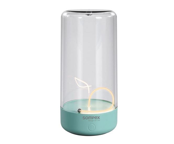 Hier in Türkis: die witzige aufladbare Tischleuchte für Drinnen und Draußen heißt PULSE von Sompex.
