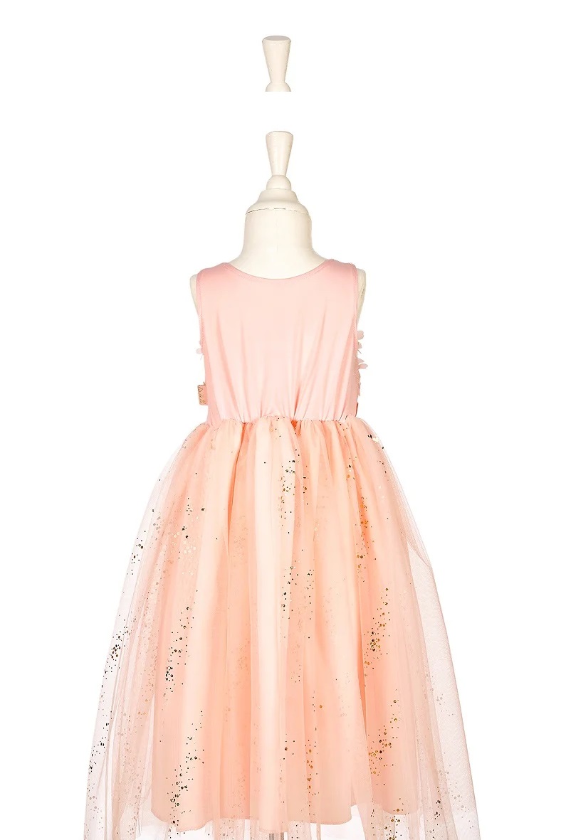 Das schicke roséfarbene Kleid Evelynn von Souza! punktet mit tollen Details: 3D Blüten im Oberteil, eine apricotfarbene Schärpe, ein doppellagiger Rock. Der Tüll-Überrock mit Glitter ist ein besonderes Highlight.