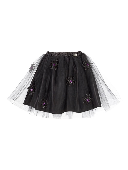 Der tolle mehrlagige Tüllrock hat in der obersten Lager glitzernde Spinnen appliziert. Die haben als Körper einen lila Schmuckstein - très chic!
