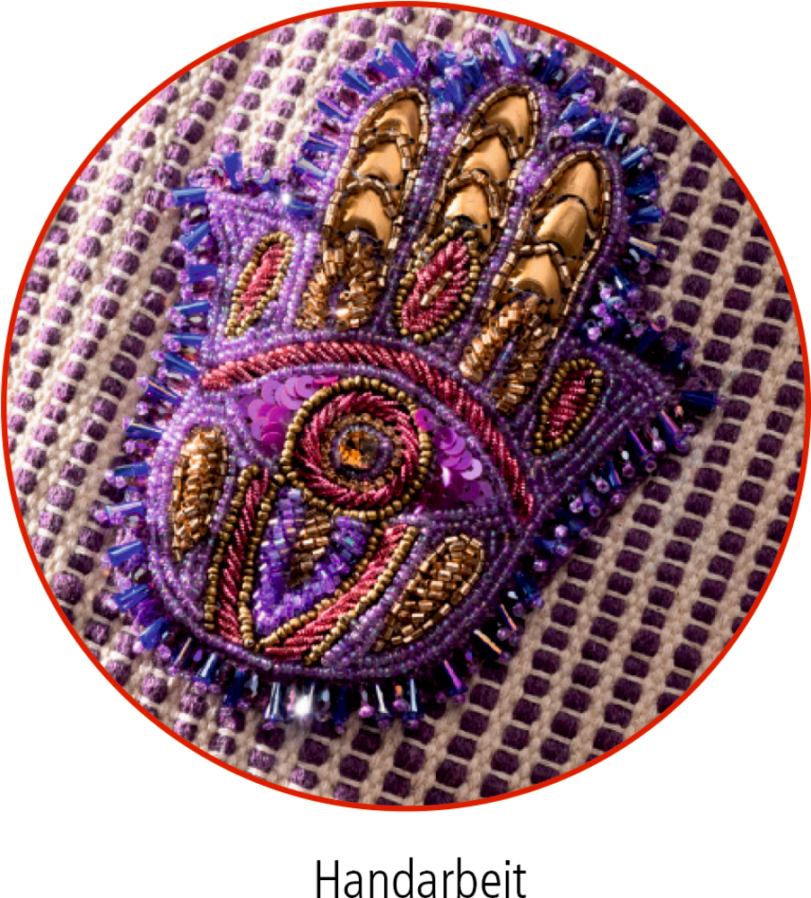 Große Shoppingtasche in Lila und Wollweiß mit Hamsa Handmotiv. Die Vorderseite der Tasche ist handgewebt, die Hand-Applikation hat eine aufwendige Perlenstickerei.