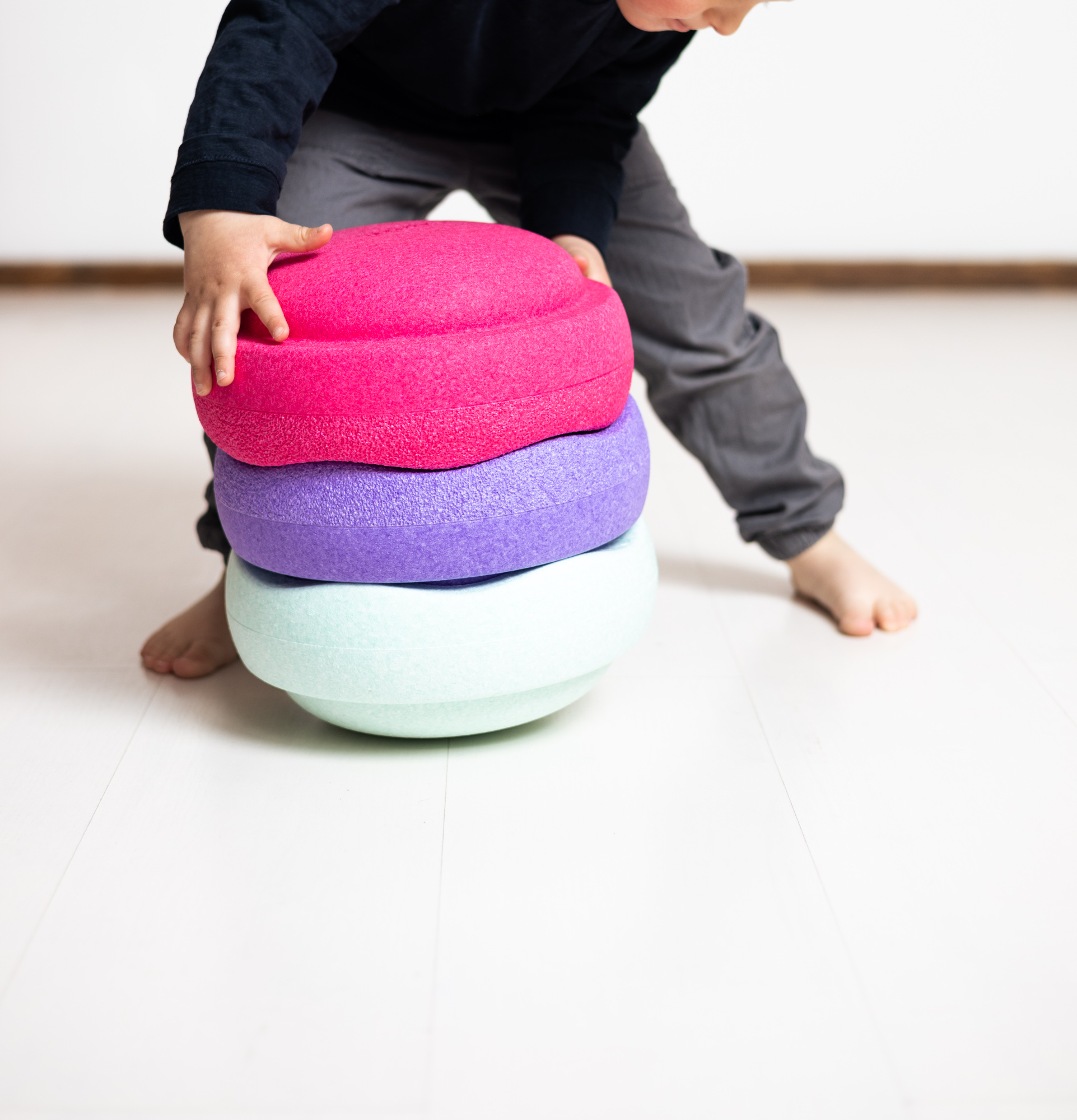 - Ältere Kinder können immer anspruchsvollere Balance-Parcours legen. Man kann in die Stapelsteine oder auf die Stapelsteine treten, Treppen bauen, sie mit anderen Elementen kombinieren. Versucht mal, mit drei Stapelsteinen über einen gedachten Fluß zu kommen.