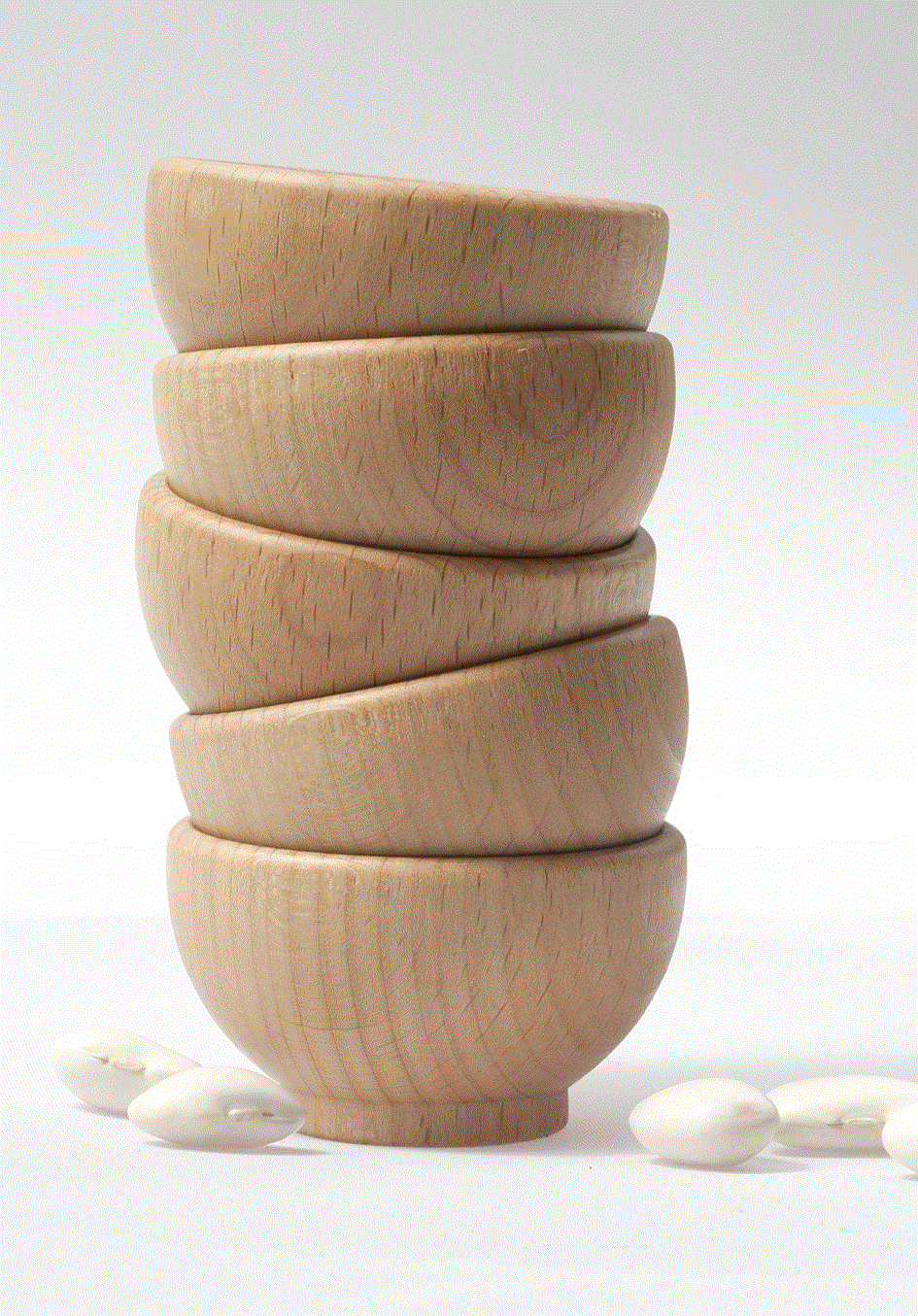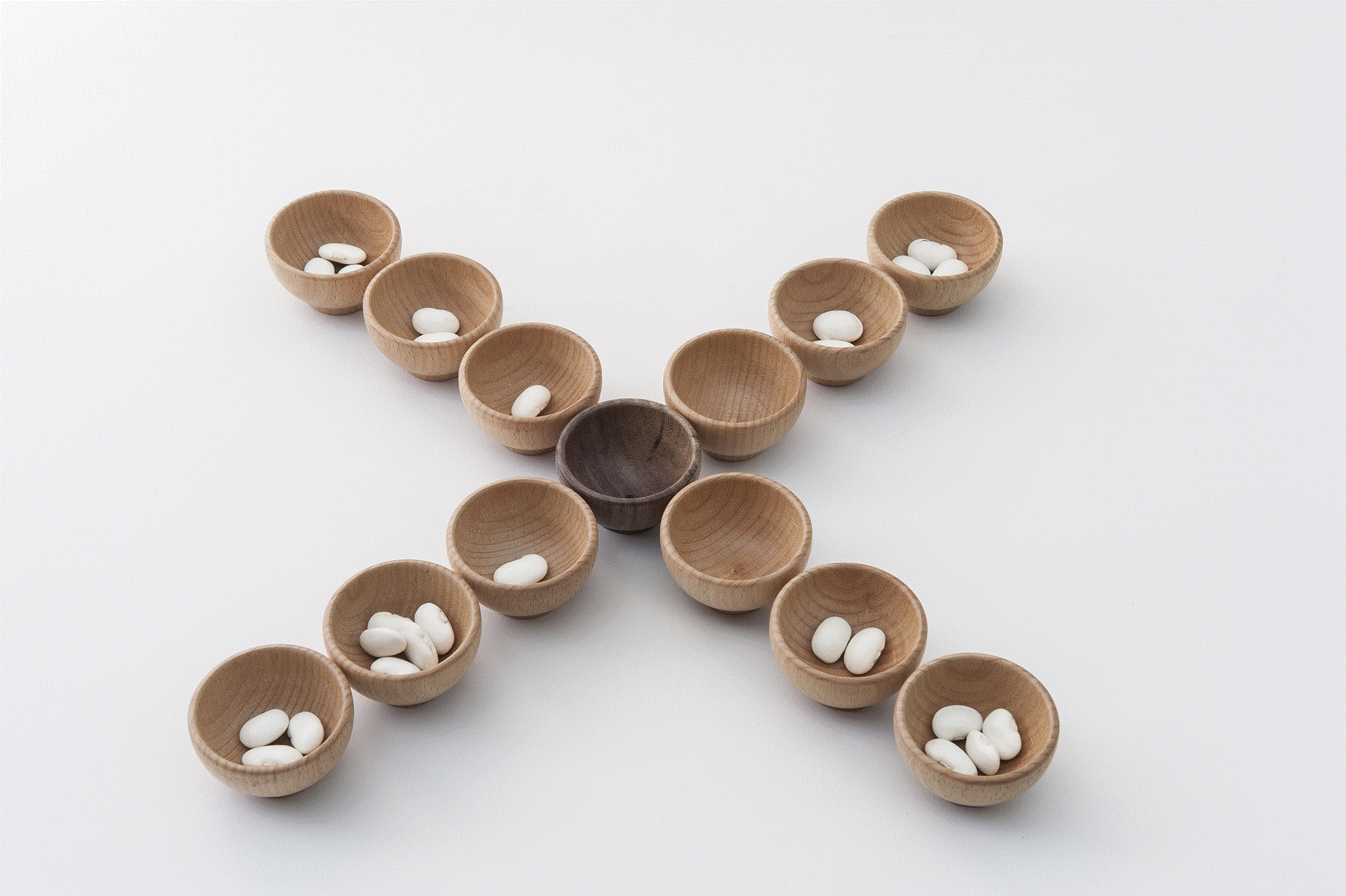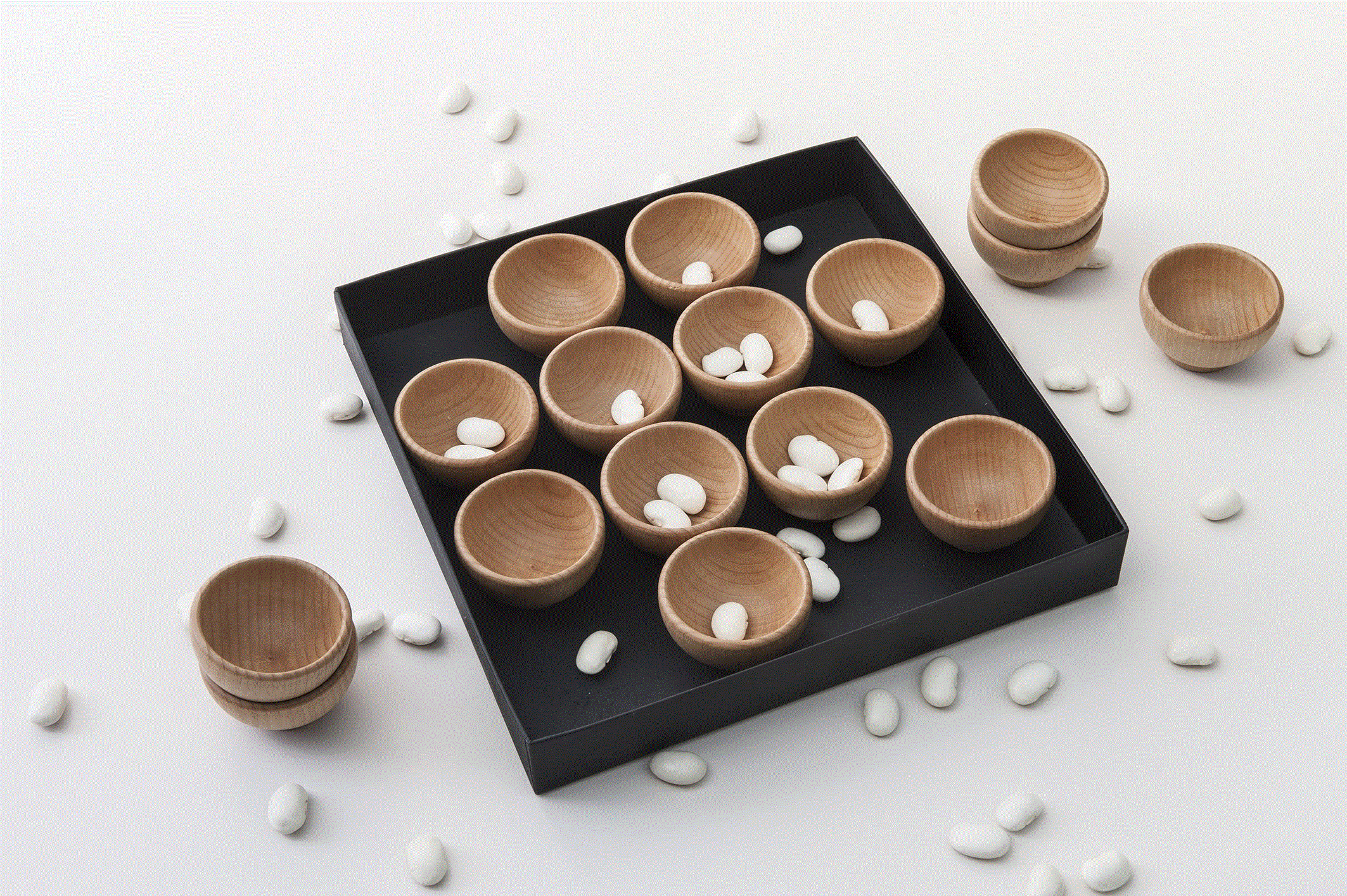 COPA ist mehr als ein Spiel. 18 schöne Holzschalen aus Buche, Ahorn und Kastanie und ein Kästchen voller weißer Bohnen bilden das einfache und variable Spielmaterial für vier verschiedene Spiele.
