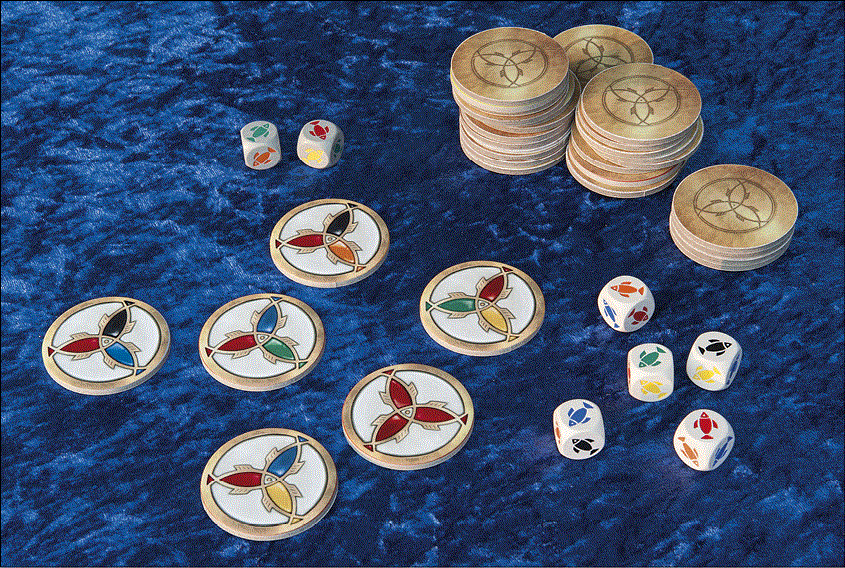 Ein bunter Fischschwarm tummelt sich auf dem Tisch, die Spieler werfen ihre Netze aus. Geangelt wird mit einer Handvoll Würfel. Wer die passenden Farben würfelt, darf eines der begehrten Medaillons mit drei Fischen an Land ziehen.
