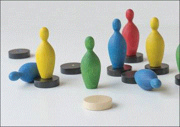 Inhalt: 10 Holzkegel, 11 Holzscheiben, Spielanleitung