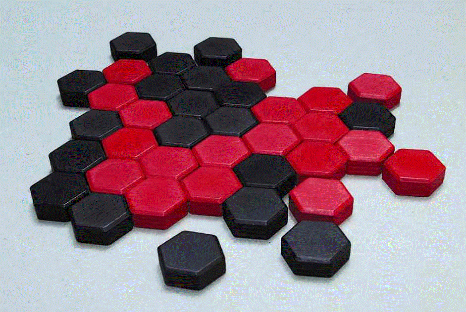 Zug um Zug wird das Wabenfeld aus sechseckigen Spielsteinen in schwarz und rot weiter ausgebaut. Ziel ist es, als Erster sechs Steine der eigenen Farbe zu einem Dreieck, einem Kreis oder einer Reihe zu verbinden. Sind alle Steine ohne diesen Sechser ausgelegt, wird in der zweiten Runde gesprungen und geschlagen! Dauer 10-30 MInuten