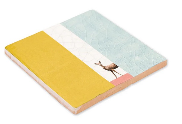 Small StoryTile I see you dear im Design von Marga von Oers. Mit dieser collageartig eingebetteten Hirschkuh im Farbspiel von Blau und Gelbgrün.