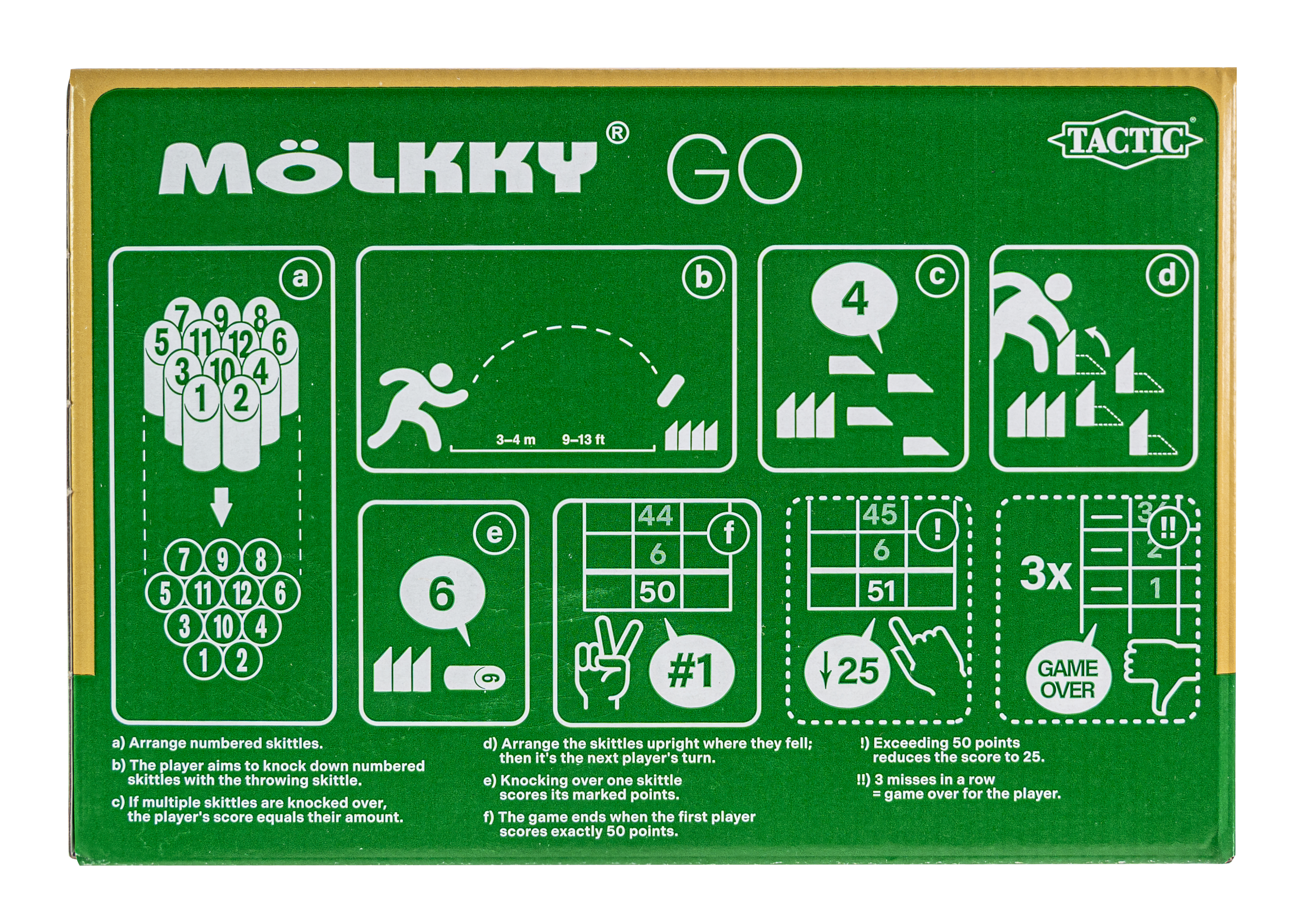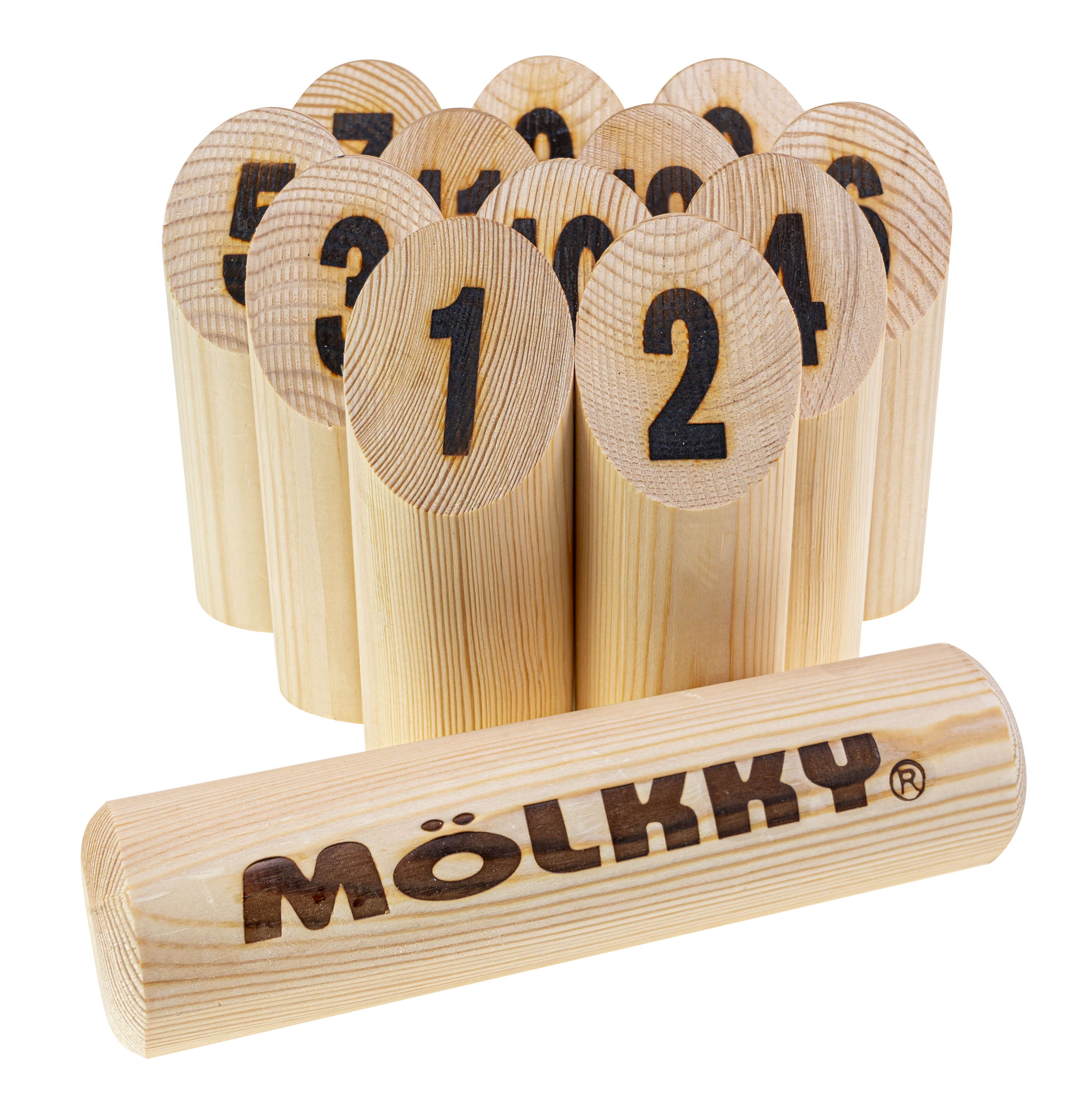 • Inhalt: 12 nummerierte Mölkky-Hölzer, 1 Wurfholz, 1 Transportkarton
