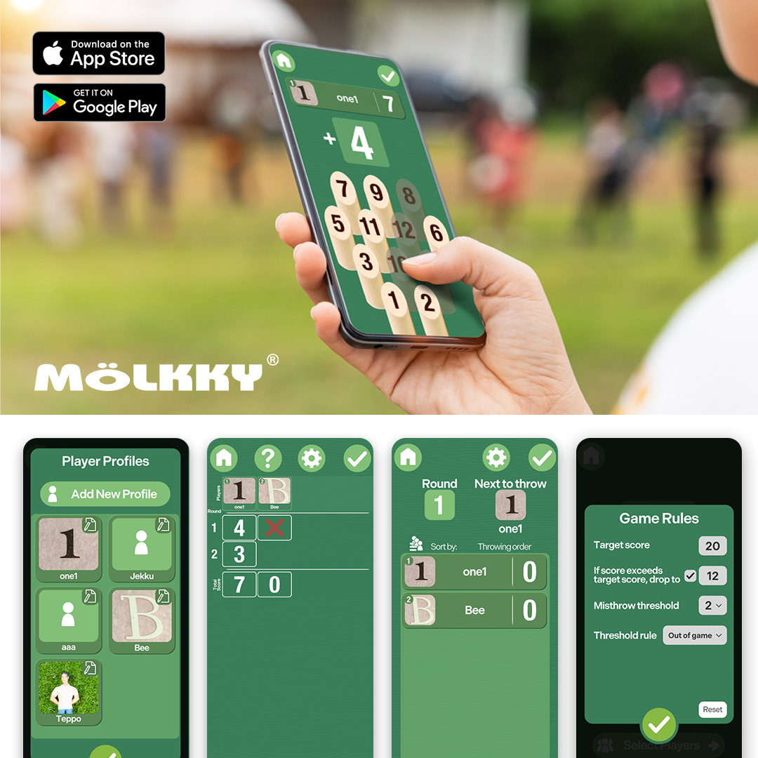 Dazu gibt´s die Mölkky-Online-App zum einfachen Addieren der Punktestände!