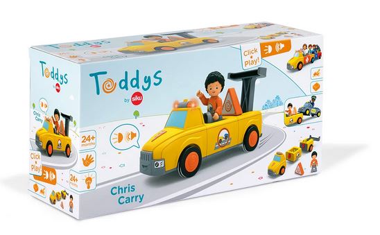 Das Fahrzeug Carry lässt sich durch einen einfachen Dreh-Klick-Mechnismus in drei Teile zerlegen und kann mit weiteren Toddys-Fahrzeugen kreativ kombiniert werden. Der Abschlepphaken ist beweglich und kann andere Toddy-Fahrzeuge aufsatteln. Die Spielfigur kann sitzen und stehen sowie die Arme und den Kopf bewegen.