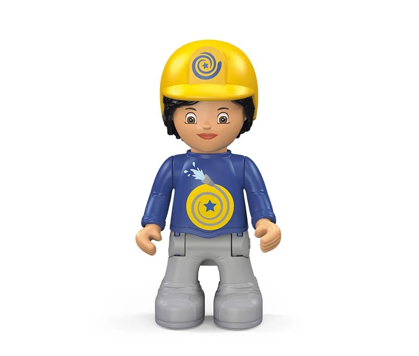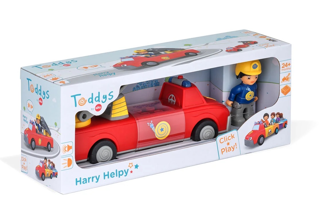 Das Fahrzeug Helpy lässt sich durch einen einfachen Dreh-Klick-Mechnismus in drei Teile zerlegen und kann mit weiteren Toddys-Fahrzeugen kreativ kombiniert werden. Die Leiter lässt sich ausziehen und drehen. Die Spielfigur kann sitzen und stehen sowie die Arme und den Kopf bewegen.