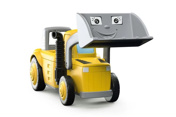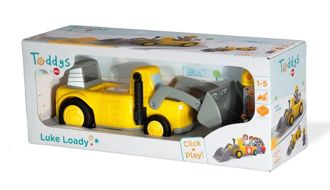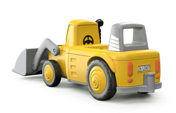 Das Fahrzeug Loady lässt sich durch einen einfachen Dreh-Klick-Mechnismus in zwei Teile zerlegen und kann mit weiteren Toddys-Fahrzeugen kreativ kombiniert werden. Vorne gibt es eine bewegliche Schaufel. An der Rückseite des Baufahrzeugs gibt es eine Kupplung für Anhänger (z.B. von dem Farmy Fahrzeug).