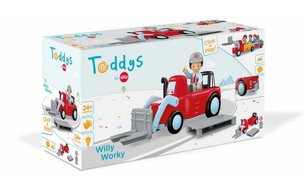 Das Fahrzeug Worky lässt sich durch einen einfachen Dreh-Klick-Mechnismus in zwei Teile zerlegen und kann mit weiteren Toddys-Fahrzeugen kreativ kombiniert werden. Zu der beweglichen Staplergabel ist eine passende Palette im Set und so kann allerlei bewegt werden. Die Spielfigur kann sitzen und stehen sowie die Arme und den Kopf bewegen.