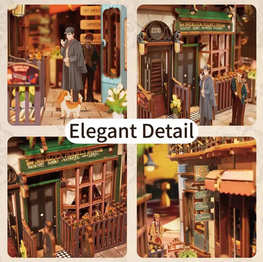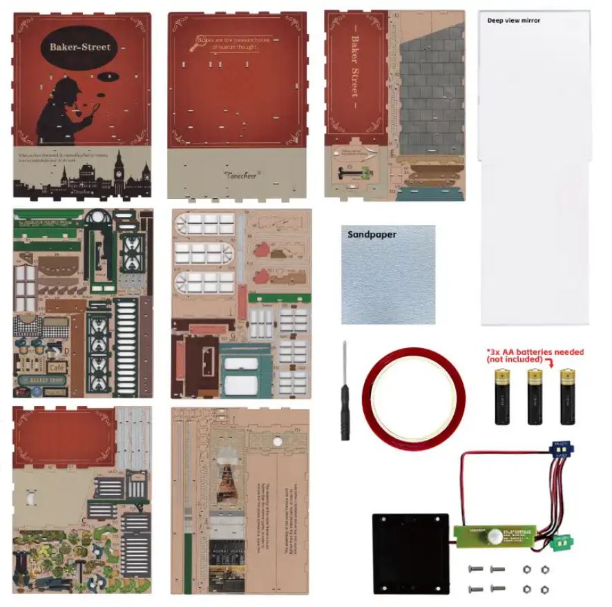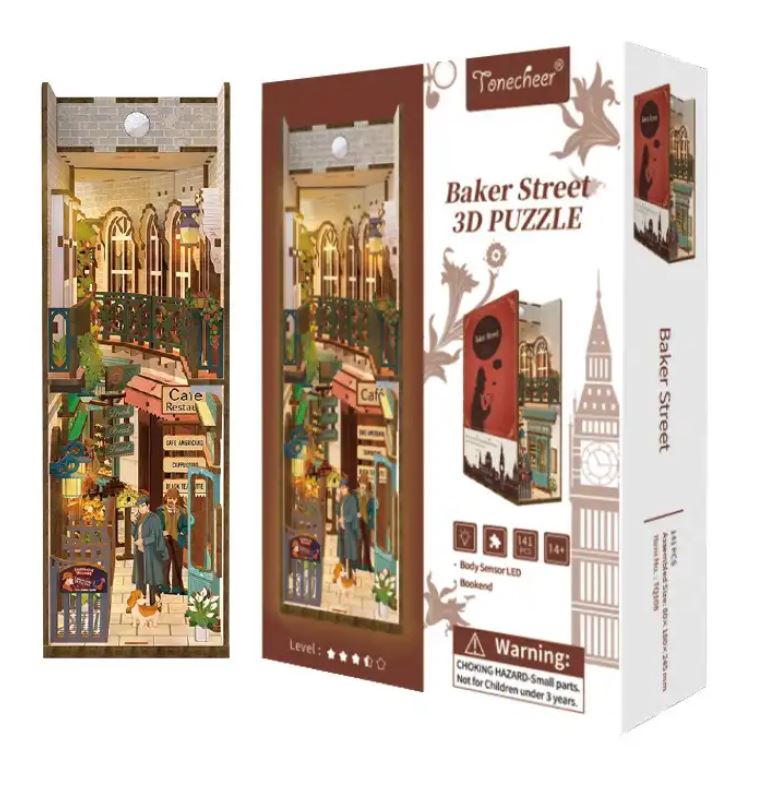 Das Tonecheer Bastelset Book Nook Baker Street entführt in die geheimnisvolle Welt des berühmten Detektives Sherlock Holmes und seines Gehilfen Doktor Watson. In der detailreichen Miniaturwelt findet man Holmes und Watson und viele andere Figuren und Szenen aus dem Büchern. Das Set ist mit einer Beleuchtung und Soundeffekten ausgestattet, die sich anschalten, wenn man sich dem Set nähert.