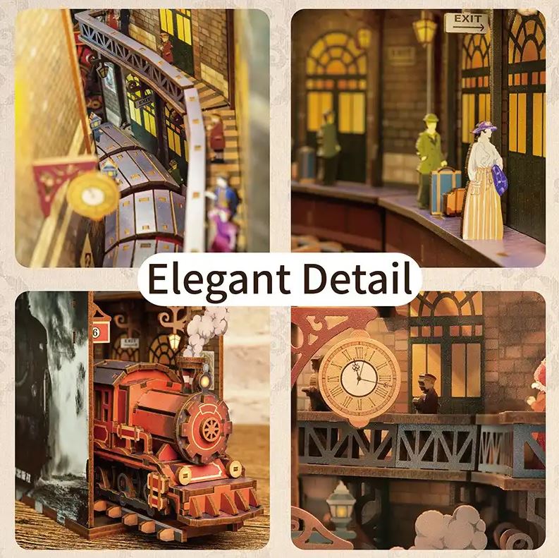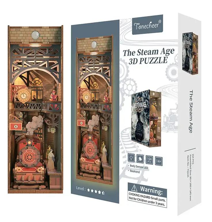 Das Tonecheer Bastelset Book Nook The Steam Age entführt in die spannende Zeit der Industrialisierung: Wir sind mit dabei, als ein historischer Dampfzug in einen alten Bahnhof einfährt. Die Reisenden tragen stilecht Kleidung dieser nostalgischen Zeit. Viele liebevolle Details laden zum Entdecken ein. Das Set ist mit einer Beleuchtung und Soundeffekten ausgestattet, die sich anschalten, wenn man sich dem Set nähert.