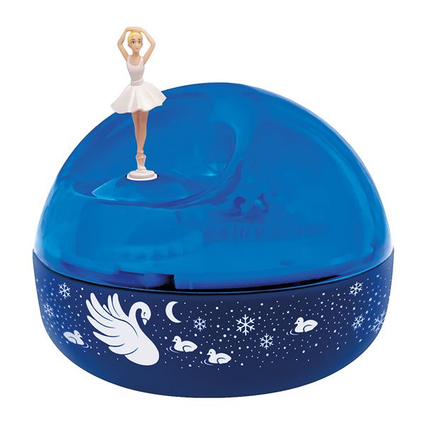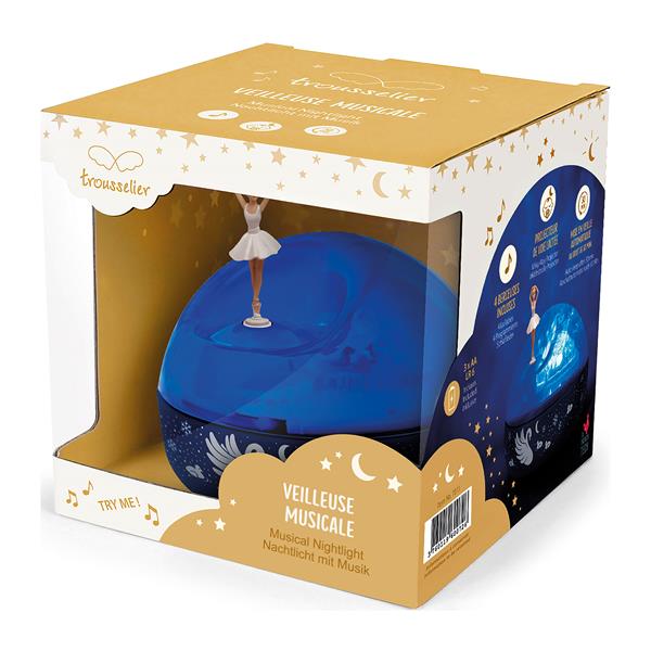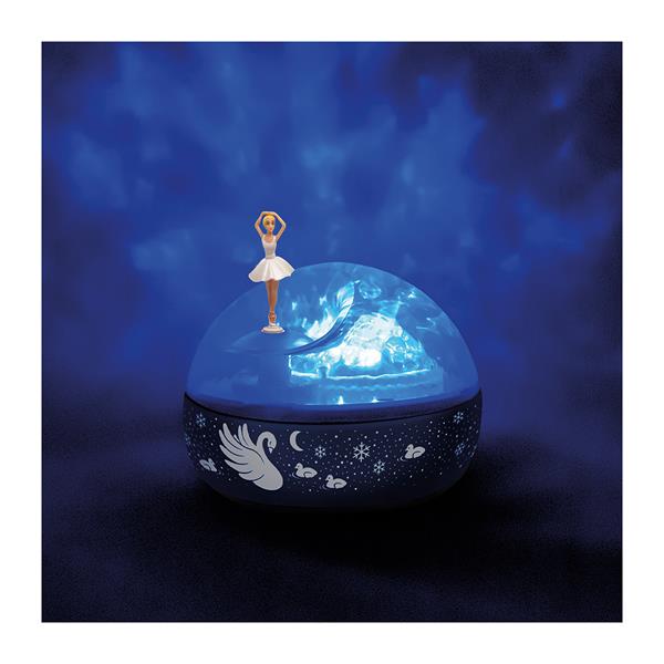 Das Nachtlicht Schwanensee von Trousselier schafft eine beruhigende Einschlafatmosphäre. Er spendet ein gedämpftes, beruhigendes Licht, die Ballerina dreht sich entspannend und bringt Kinder ins Reich der Träume. Das Licht wird auch ins Zimmer projeziert, eine Art Wasser- oder Polarhimmelstimmung entsteht.