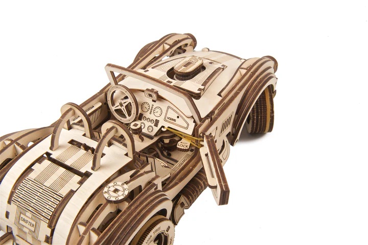 Mit dem Ugears Cobra Drift Rennwagen bekommt ihr ein superschickes Automodell aus Holz. Aber zuerst müssen 370 präzise gelaserte Holzbauteile zusammengesestzt werden! Ein großartiger Bau-und Tüftelspaß besonders für Fans von nostalgischen Fahrzeugen.
