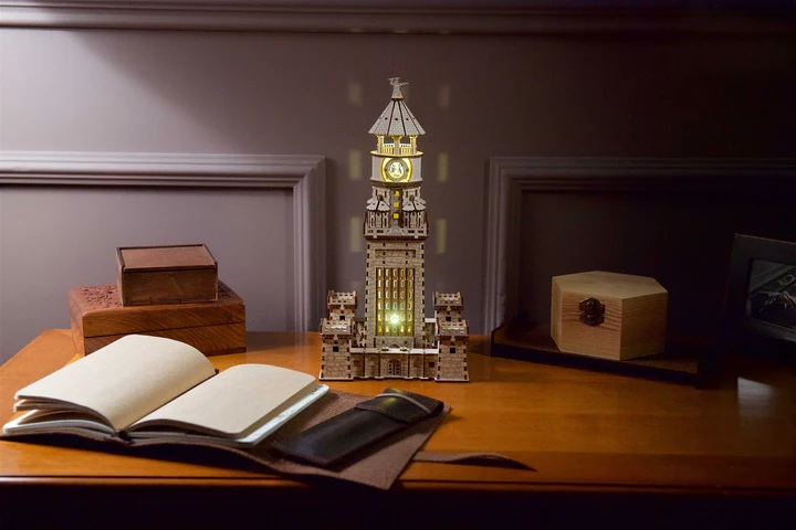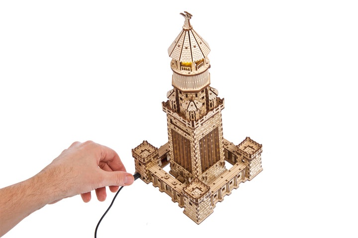 Mit dem Leuchtturm von Alexandria von Ugears bekommt ihr ein elegantes Holzmodell, das gleichzeitig eine stimmungsvolles Lichtobjekt ist.