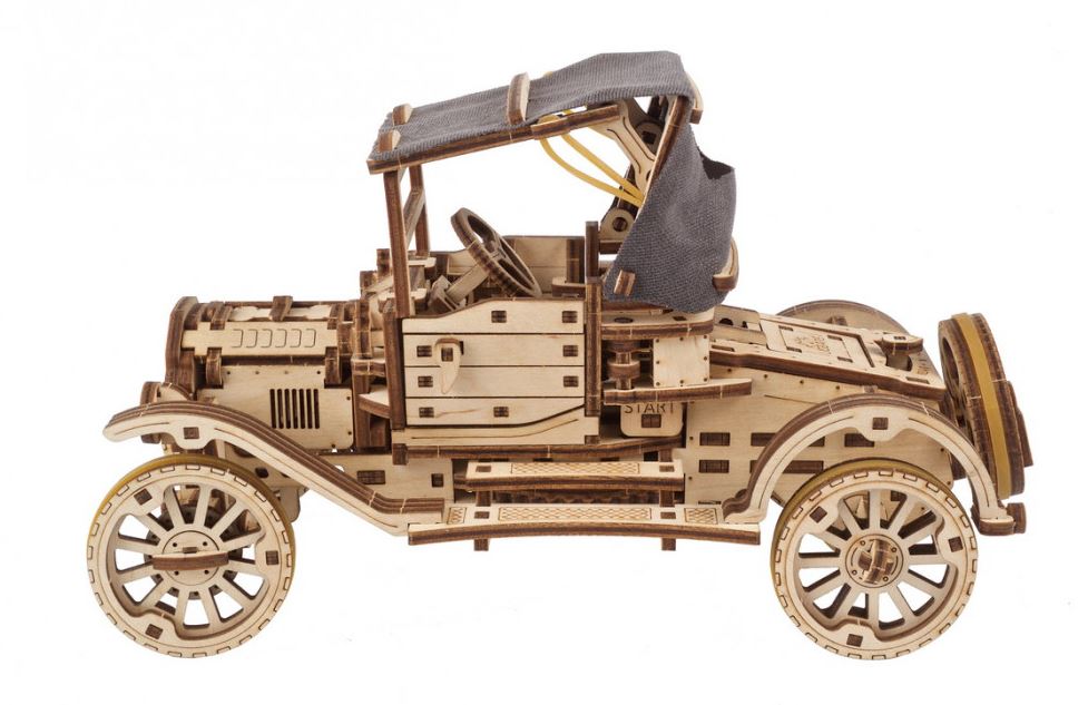 Hier ein schicker Holzbausatz eines Retro-Autos für Nostalgie-Fans. Die 337 lasergeschnittenen Holzteile werden ohne Klebstoff montiert. Eine schöne Beschäftigung mit einem tollen Ergebnis. Das gebaute Modell steht nicht nur dekorativ im regal, sonder hat auch mechanische Funktionen.