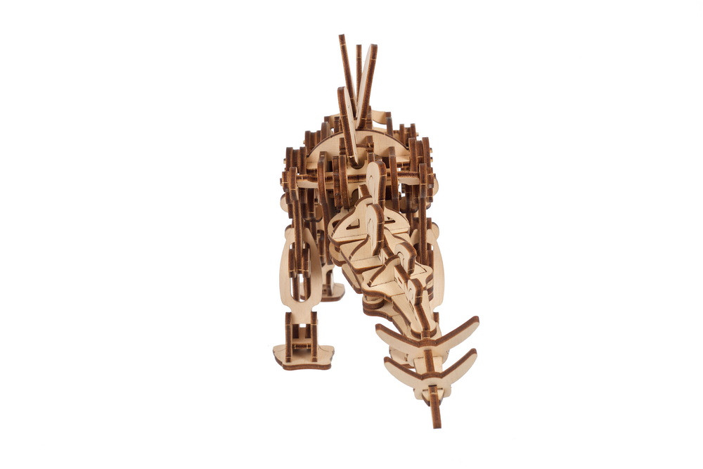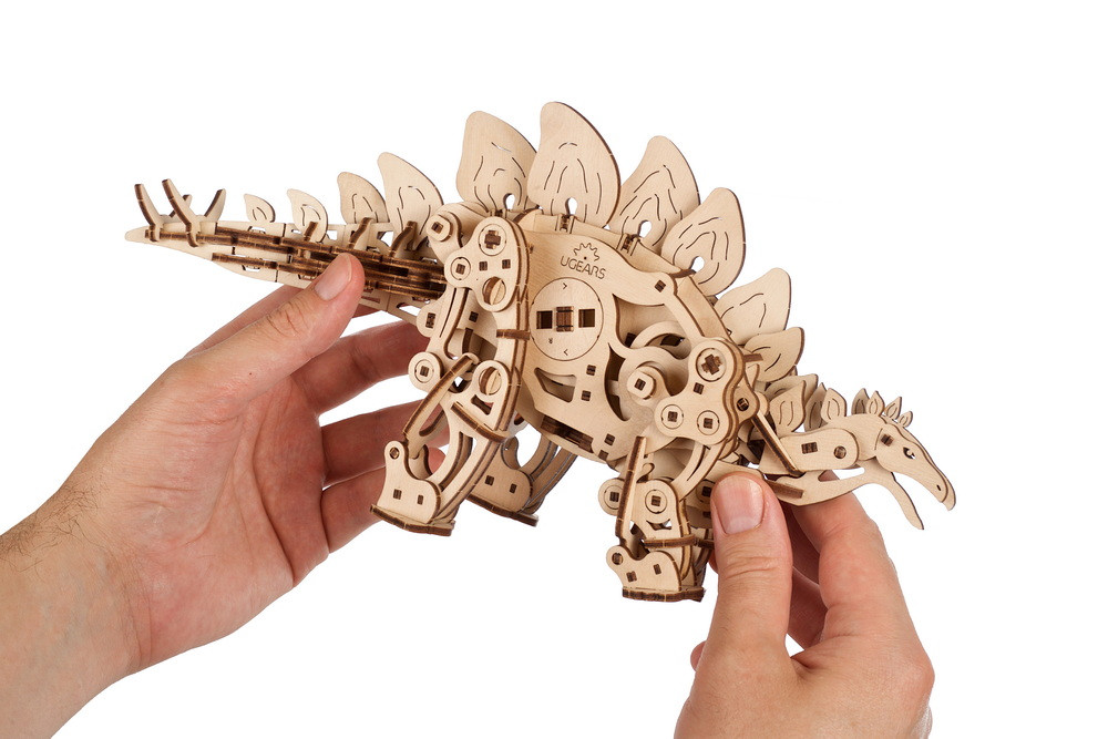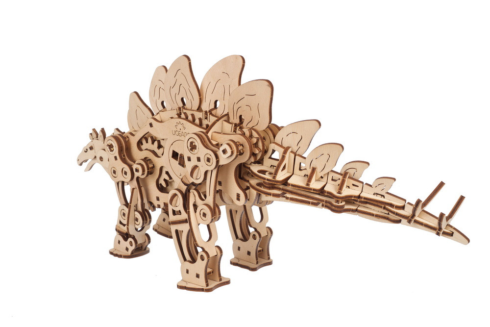 Der Stegosaurus von Ugears ist ein federbetriebener vierbeiniger DIY Dinoroboter aus Holz, der nach einmal Aufziehen bis zu 1 m zurücklegen kann. Der Schlüssel befindet sich am Bauch des Dinos und die Schlitzepaare zum Aufziehen an beiden Seiten. Das Modell wird von einer Metallfeder angetrieben, die die Kraft über ein Untersetzungsgetriebe überträgt, wodurch die Welle gedreht wird, die die Beine antreibt. Ein Exzentergetriebe lässt den Schwanz synchron zu den Beinbewegungen schwingen, was dem Dinosaurier dabei hilft, sein Gleichgewicht zu bewahren und ihn recht natürlich laufen lässt.